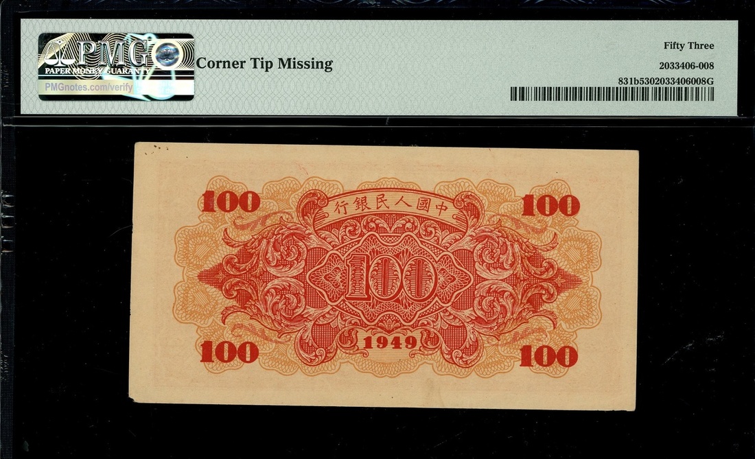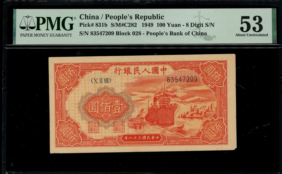 1949年中國人民銀行第一版人民幣100元「紅輪船」,編號X II VIII 83547209,PMG 53,紙角有缺