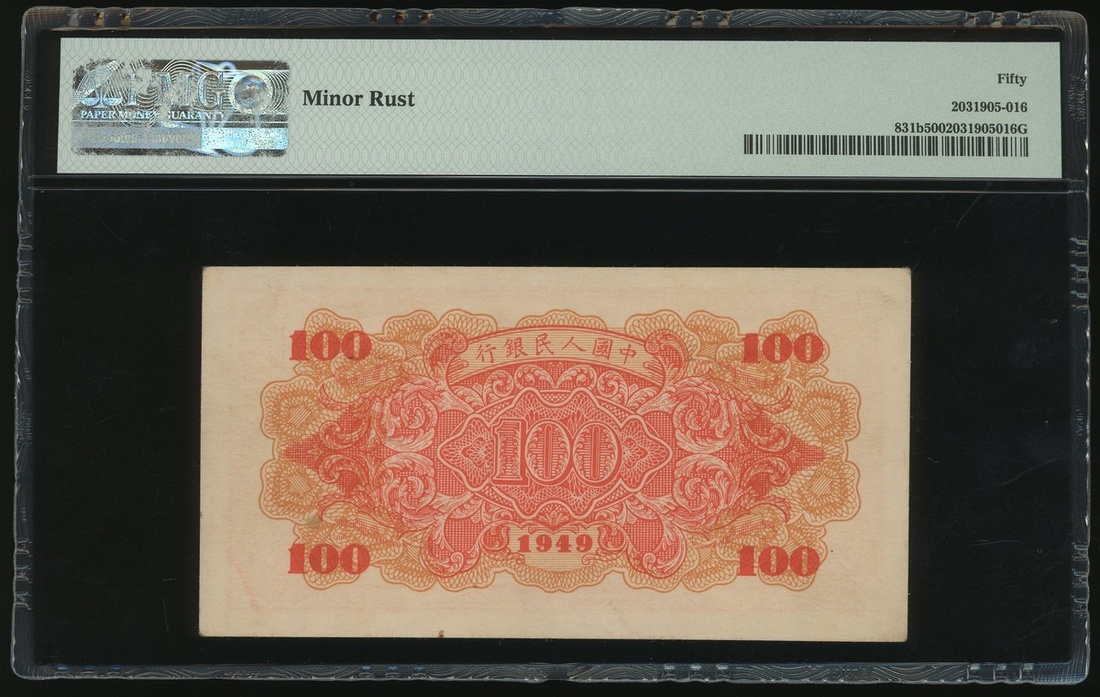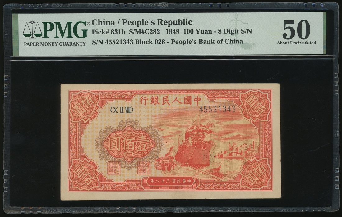 1949年中國人民銀行第一版人民幣100元「紅輪船」,編號X II VIII 45521343,PMG 50