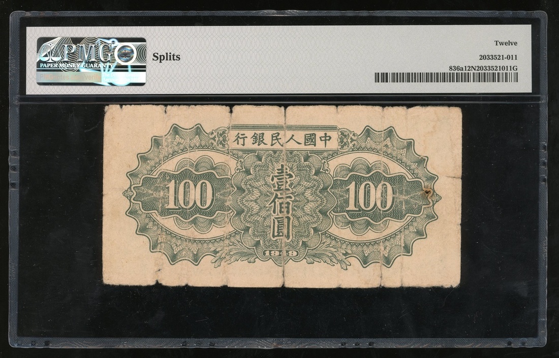 1949年中國人民銀行第一版人民幣200元「驢運」,編號VII VIII VI 3314015,PMG 12NET,有裂