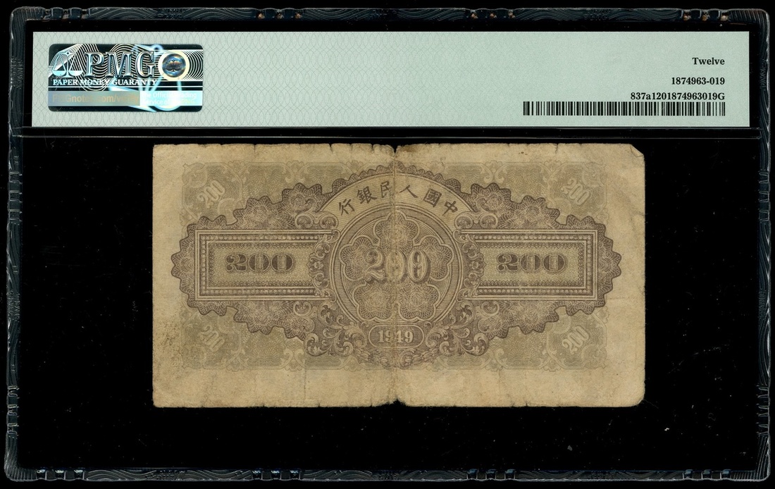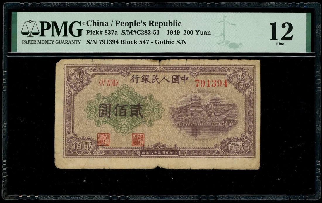 1949年中國人民銀行第一版人民幣200元「排雲殿」,編號V IV VII 791394,PMG 12