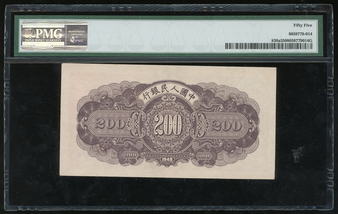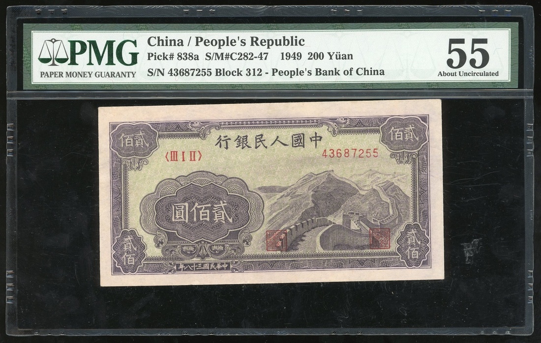1949年中國人民銀行第一版人民幣200元「長城」,編號III I II 43587255,PMG 55