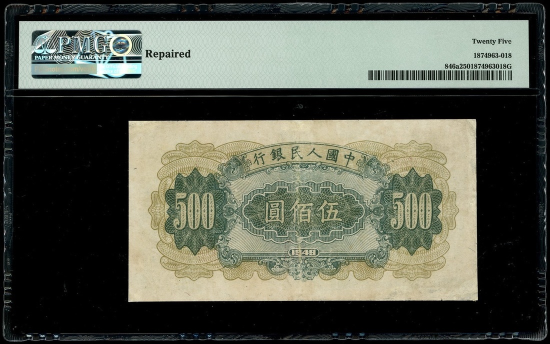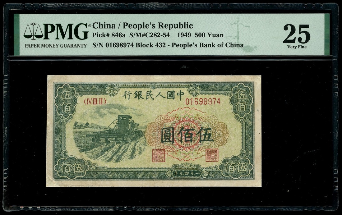 1949年中國人民銀行第一版人民幣500元「拖拉機」,編號IV III II 01698974,PMG 25,有修補
