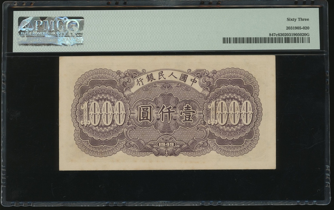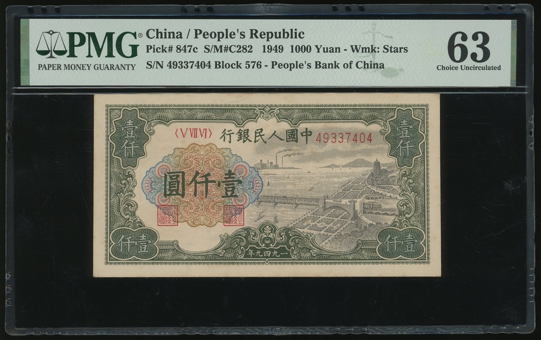 1949年中國人民銀行第一版人民幣1000元「錢塘江橋」,編號II III IV 36372492,星水印,PMG 63