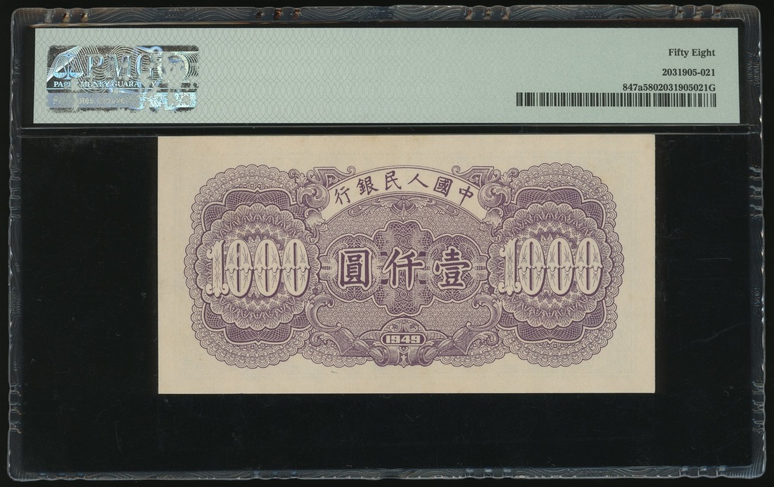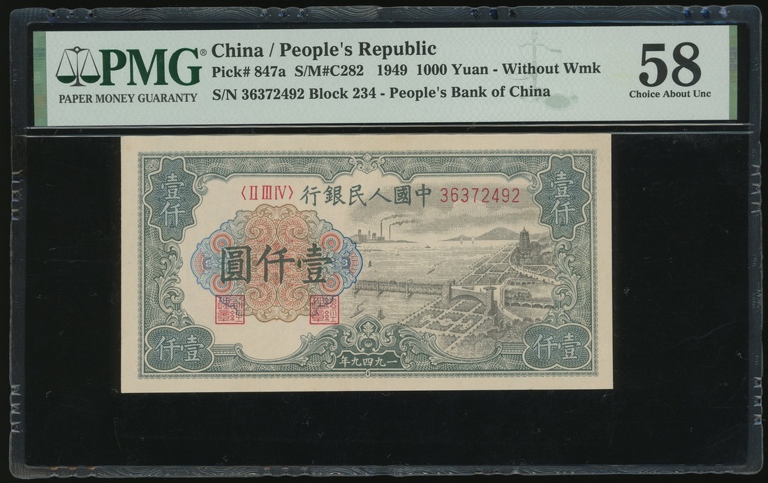 1949年中國人民銀行第一版人民幣1000元「錢塘江橋」,編號II III IV 36372492,PMG 58