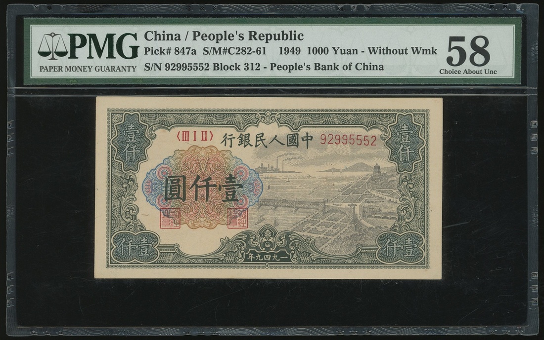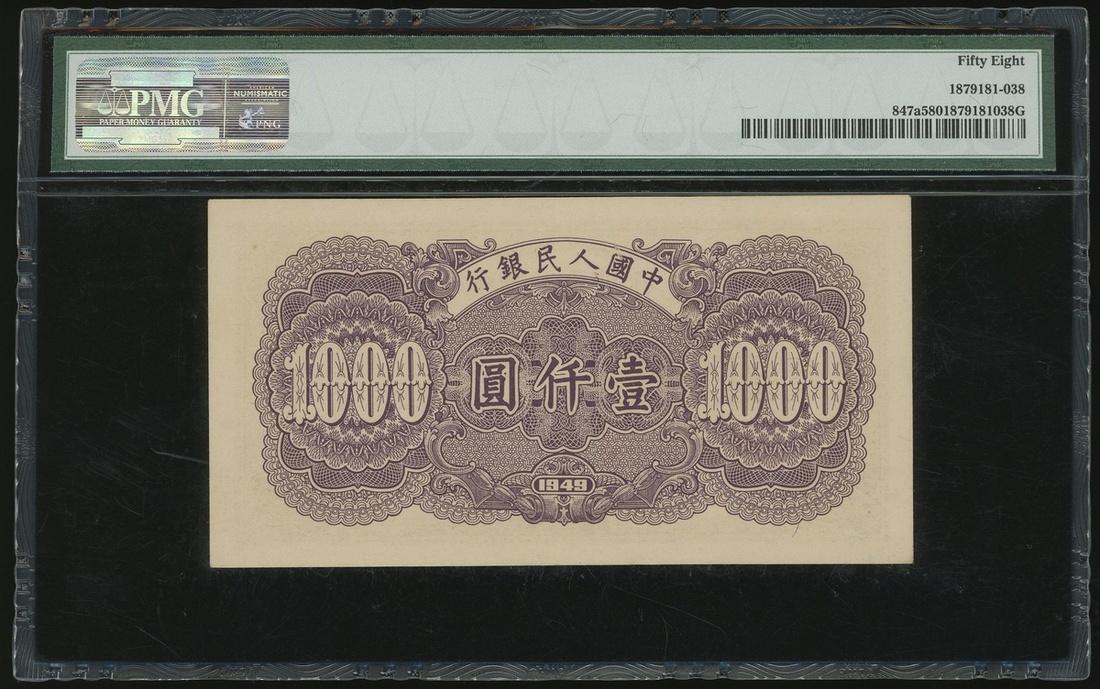 1949年中國人民銀行第一版人民幣1000元「錢塘江橋」,編號III I II 92995552,PMG 58