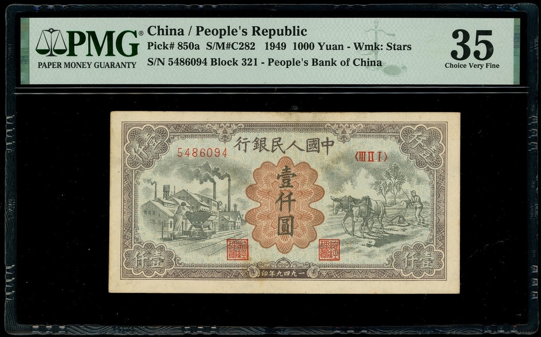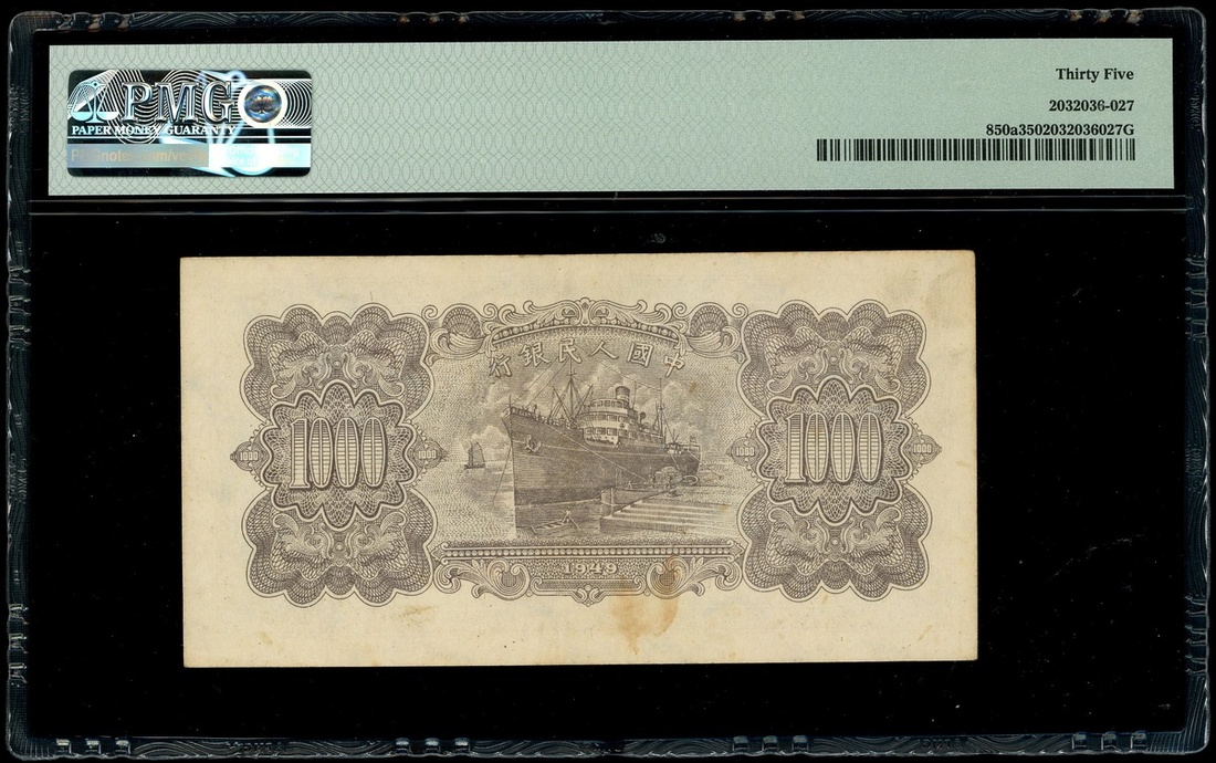 1949年中國人民銀行第一版人民幣5000元「驢子與礦車」,編號III II I 5486094,PMG 35