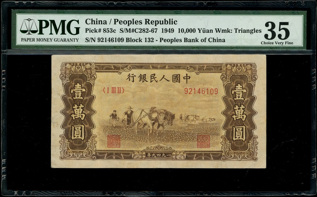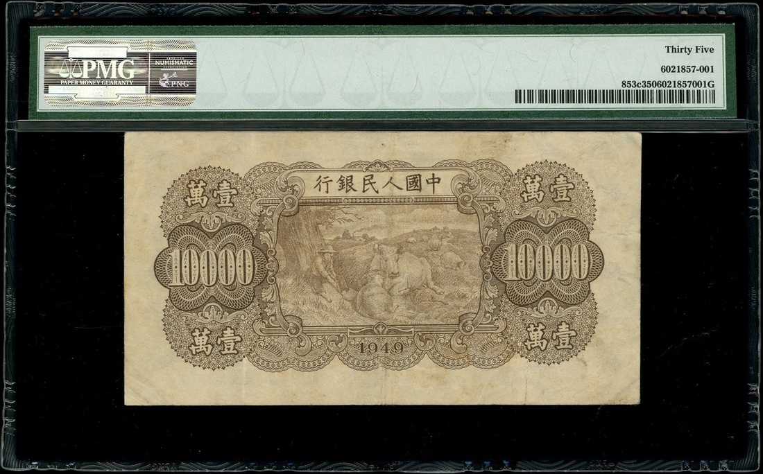 1949年中國人民銀行第一版人民幣10,000元「雙馬耕地」,編號I III II 92146109,PMG 35