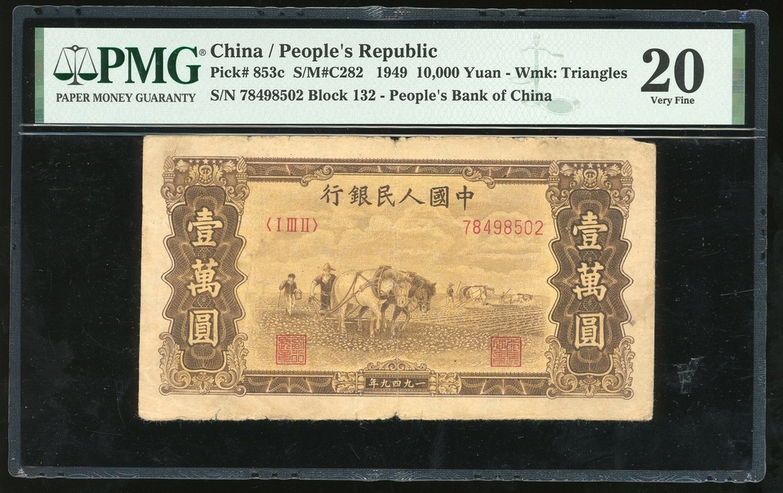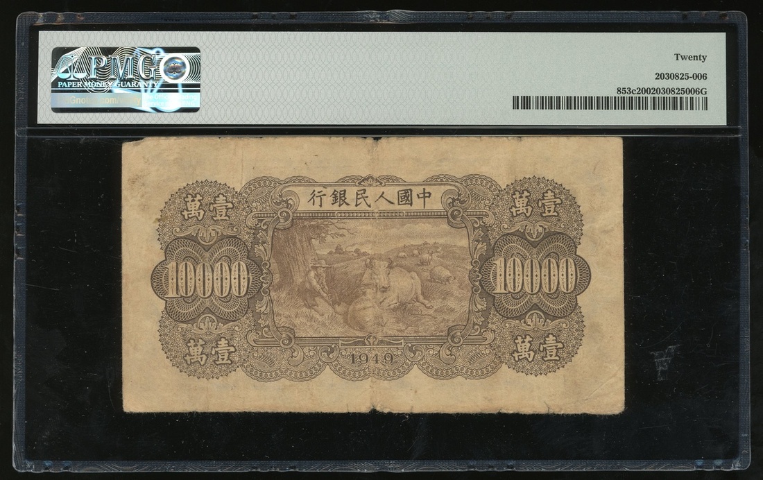 1949年中國人民銀行第一版人民幣10,000元「雙馬耕地」,編號I III II 78498502,三角水印,PMG 20