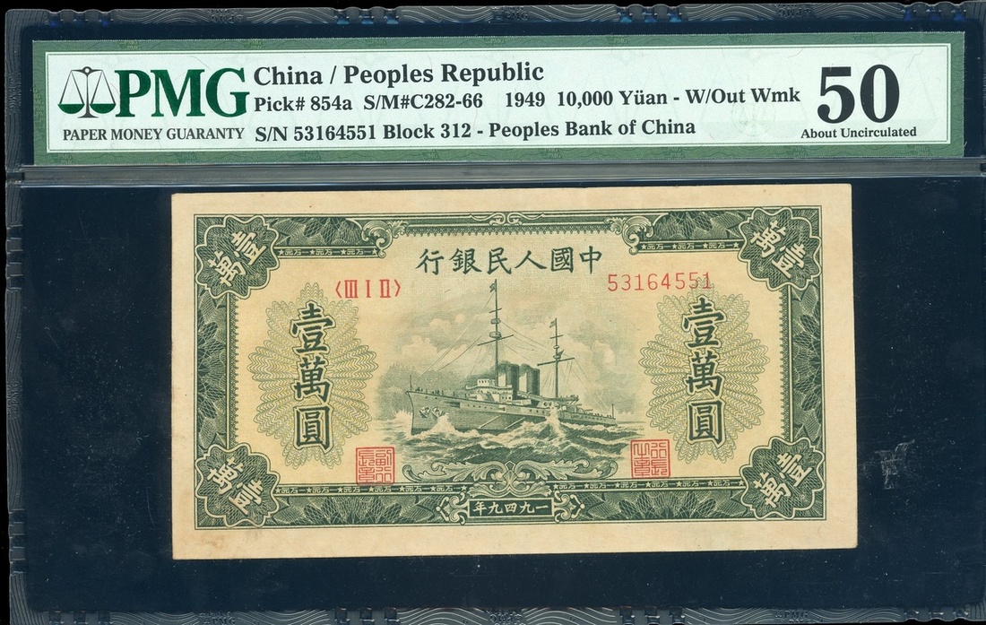 1949年中國人民銀行第一版人民幣10,000元「軍艦」,編號III I II 53164551,PMG 50