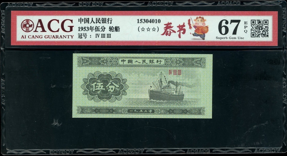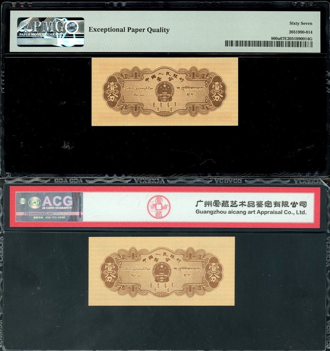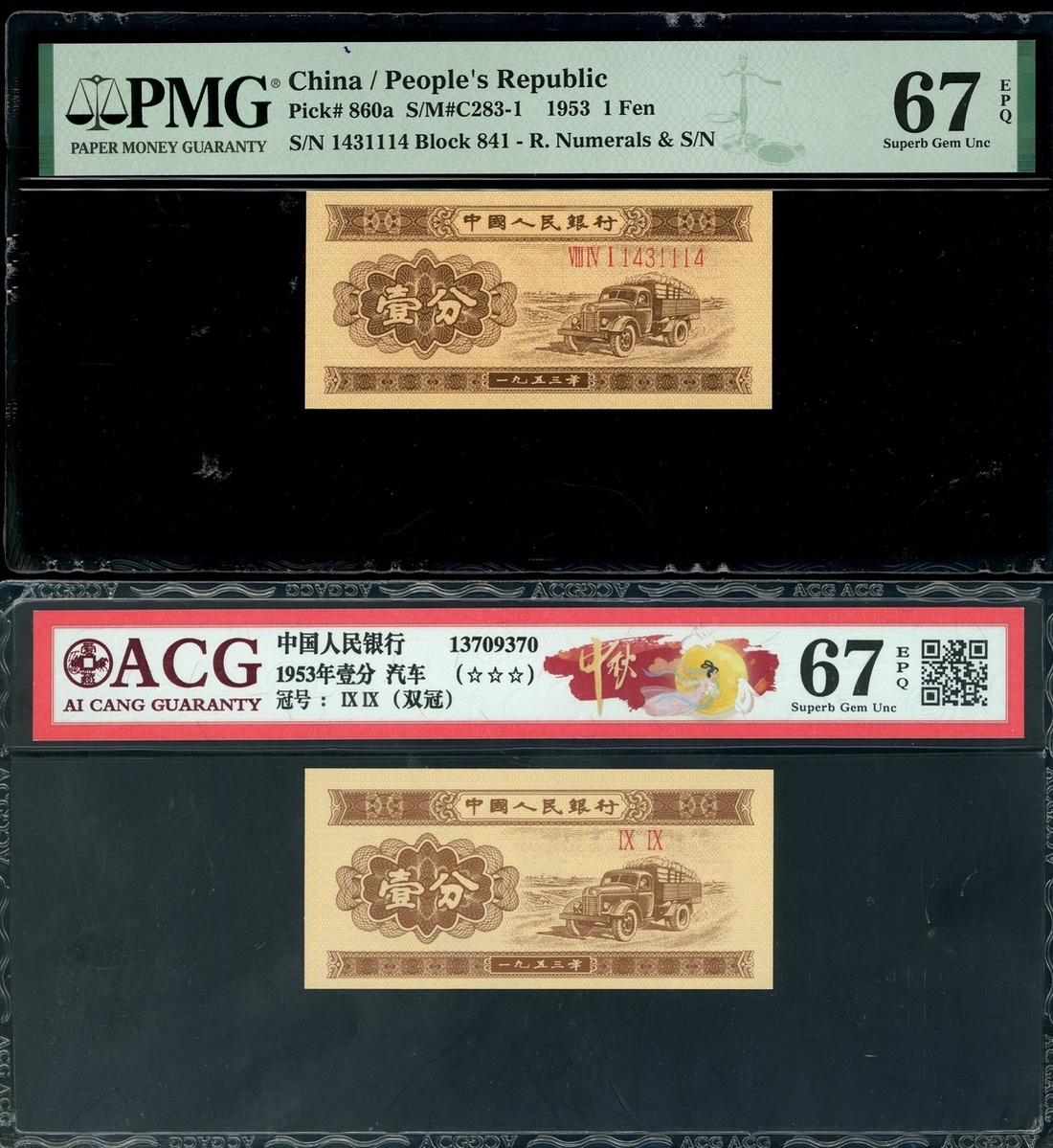 1953年中國人民銀行第二版人民幣1分,編號VIII IV I 1431114,以及1及5分,羅馬字編號,首枚評PMG 67EPQ,其他ACG 67EPQ,售後不設退換