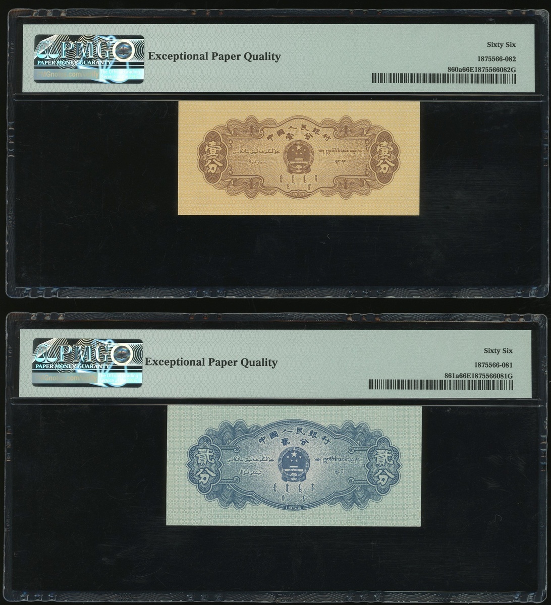 1953年中國人民銀行第二版人民幣1及2分,編號I III III 9314638及IX VI II 7022420,,均評PMG 66EPQ