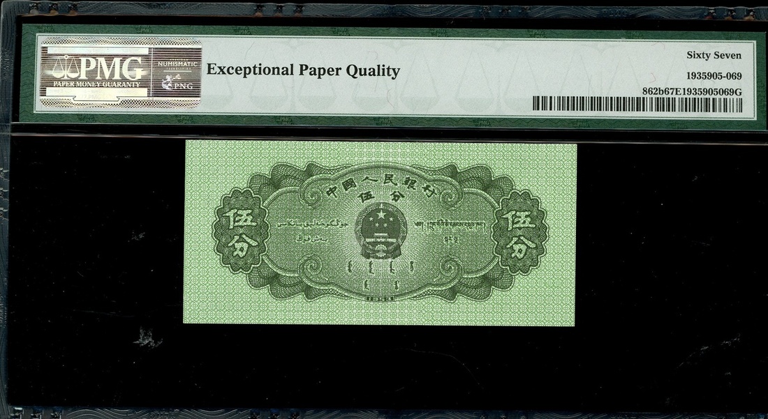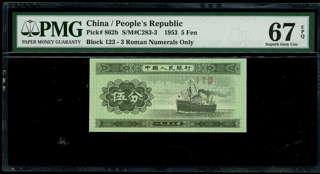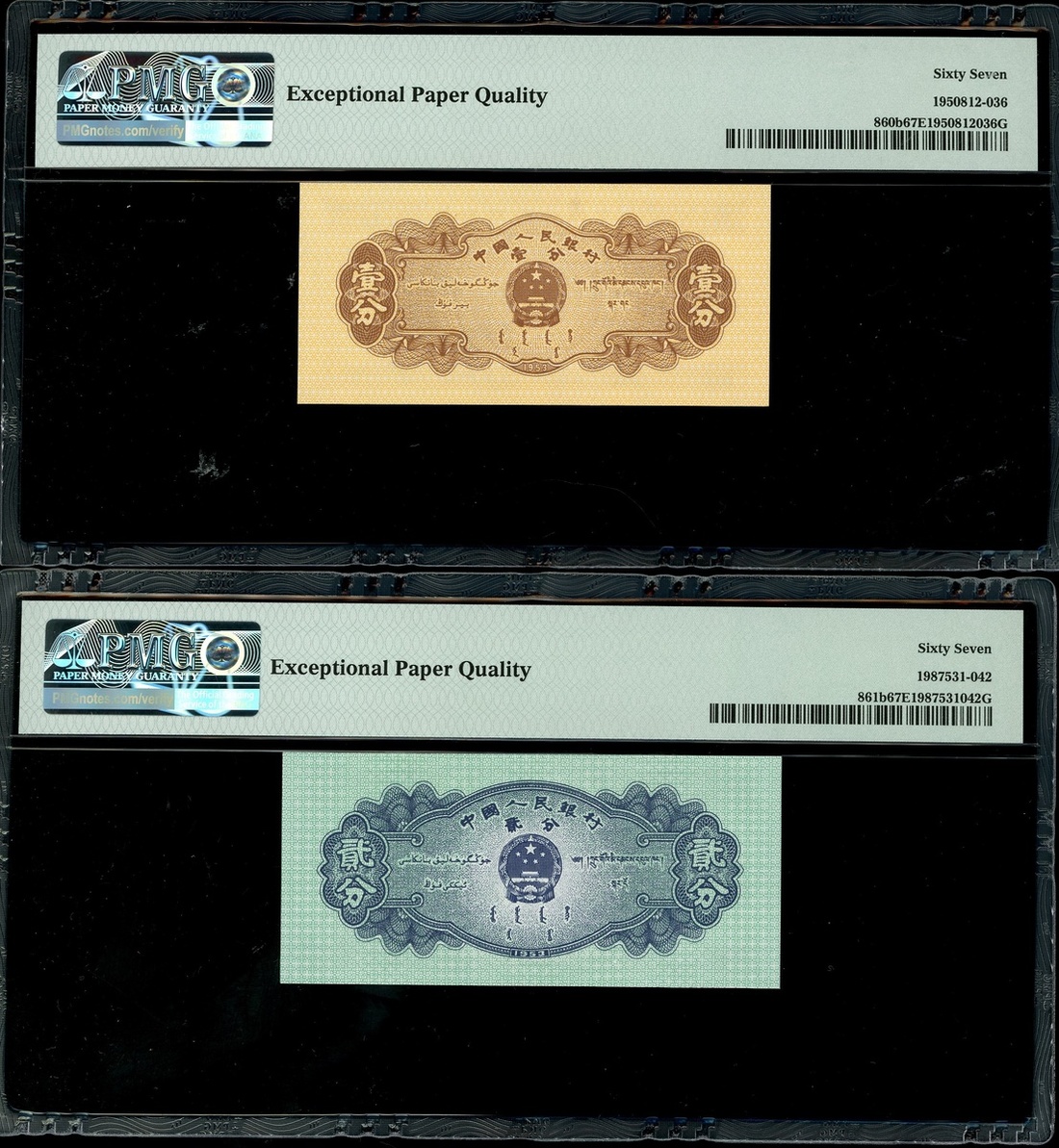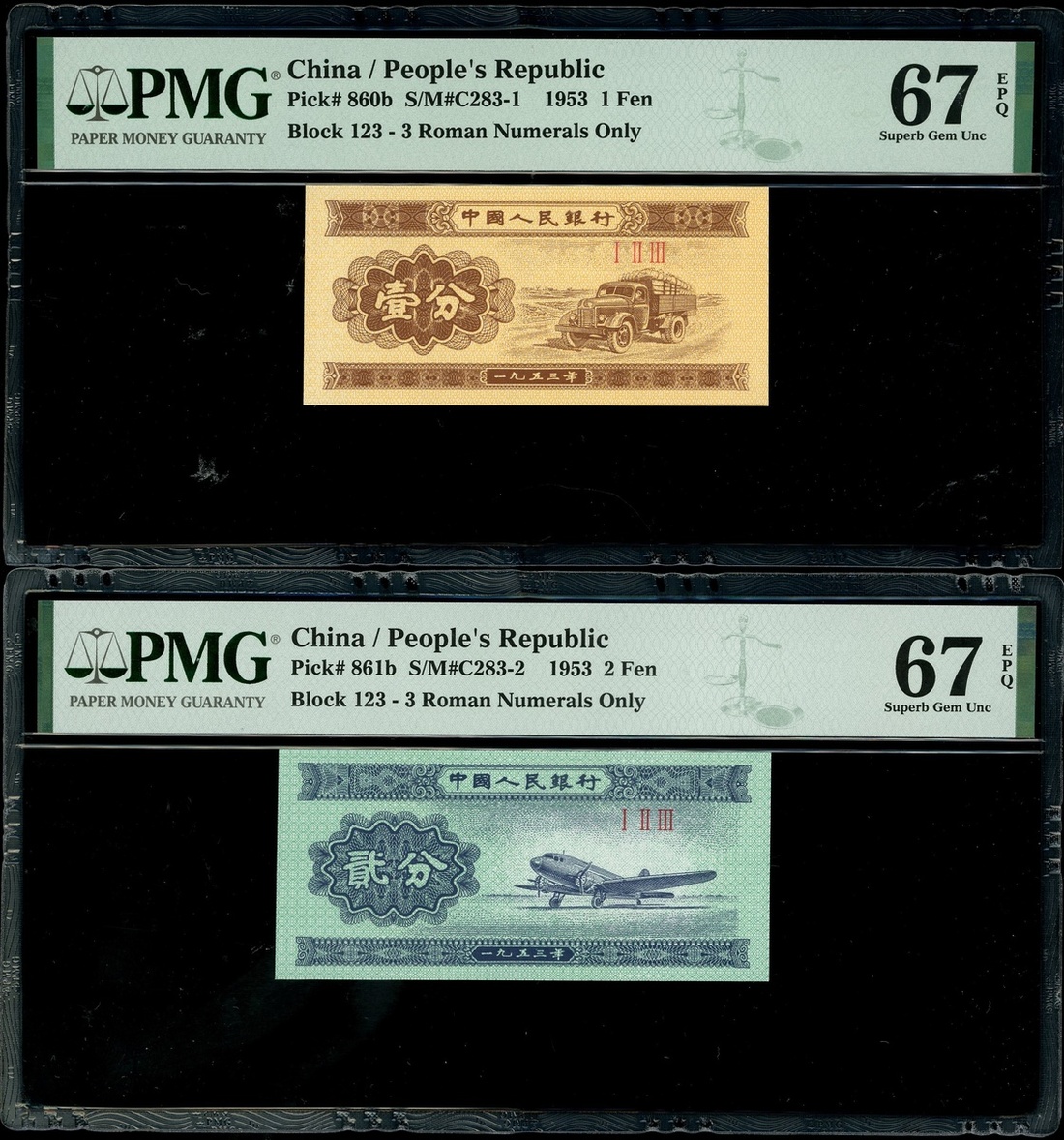 1953年中國人民銀行第二版人民幣1,2及5分,羅馬字編號,均PMG 67EPQ