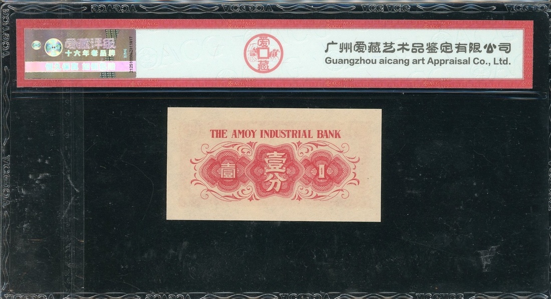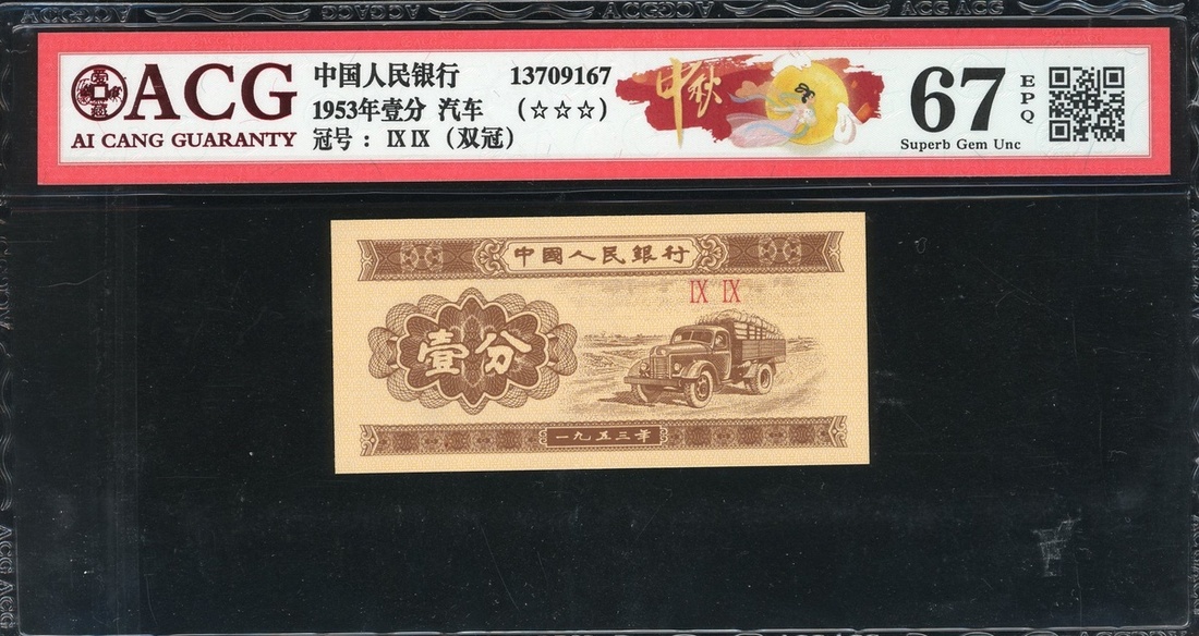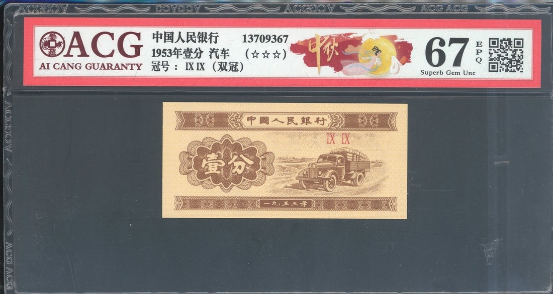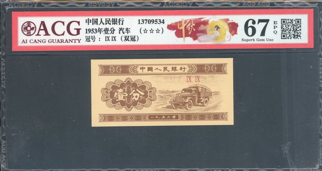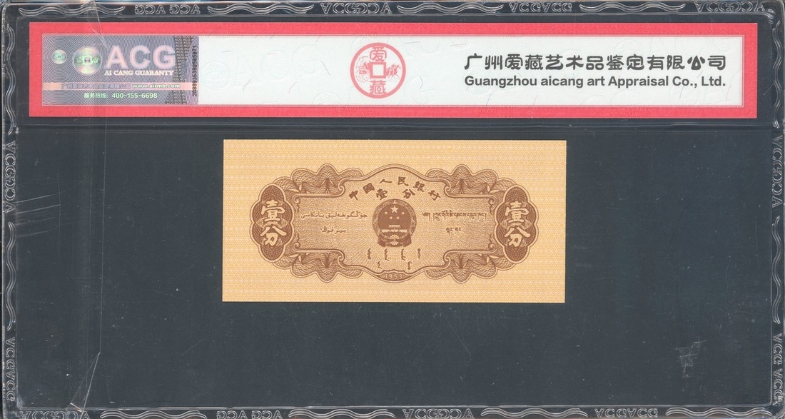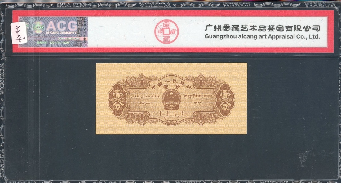 1953年中國人民銀行第二版人民幣1分4枚,2分2枚,5分1枚,羅馬字編號,第三版人民幣1962年1角,背紅藍編號X I V 0091844,以及廈門勸業銀行1分,一共8枚,均受第三方評級公司ACG認證,售後不設退換