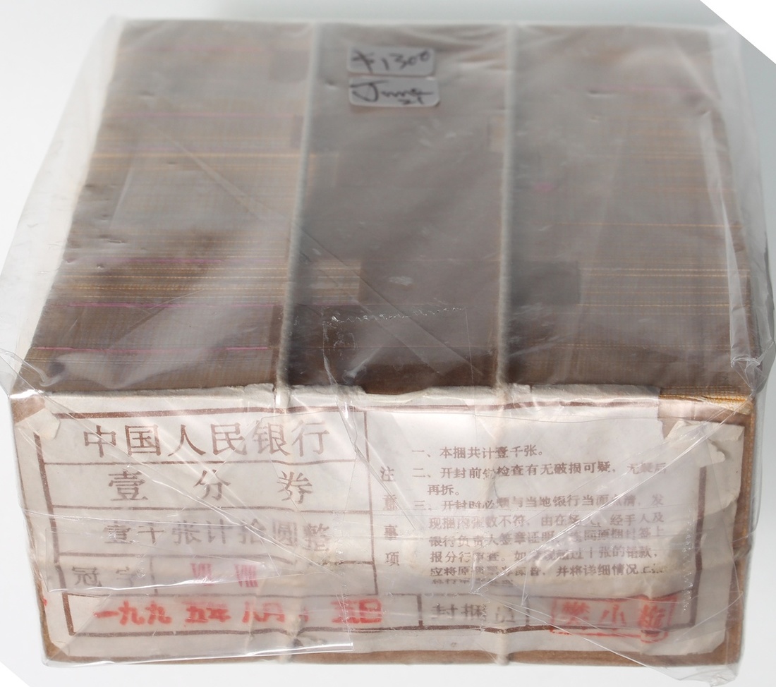 1953年中國人民銀行第二版人民幣1分1000枚一綑,羅馬字編號,UNC