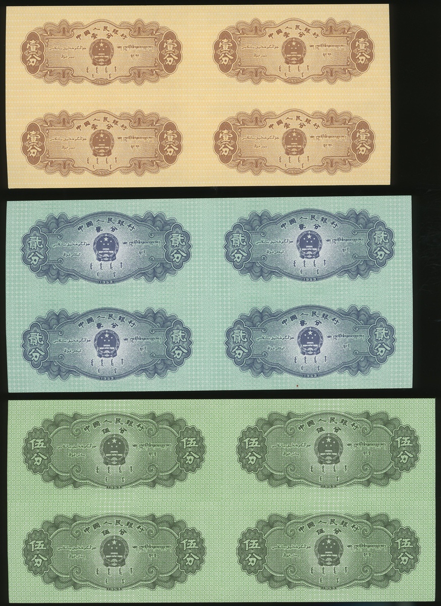 1953年中國人民銀行第二版人民幣1、2及5分,各為4連體票,羅馬字編號,均近UNC有軟折