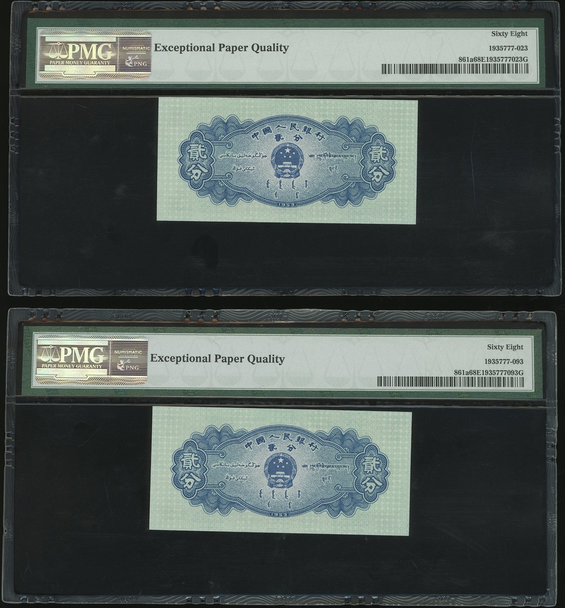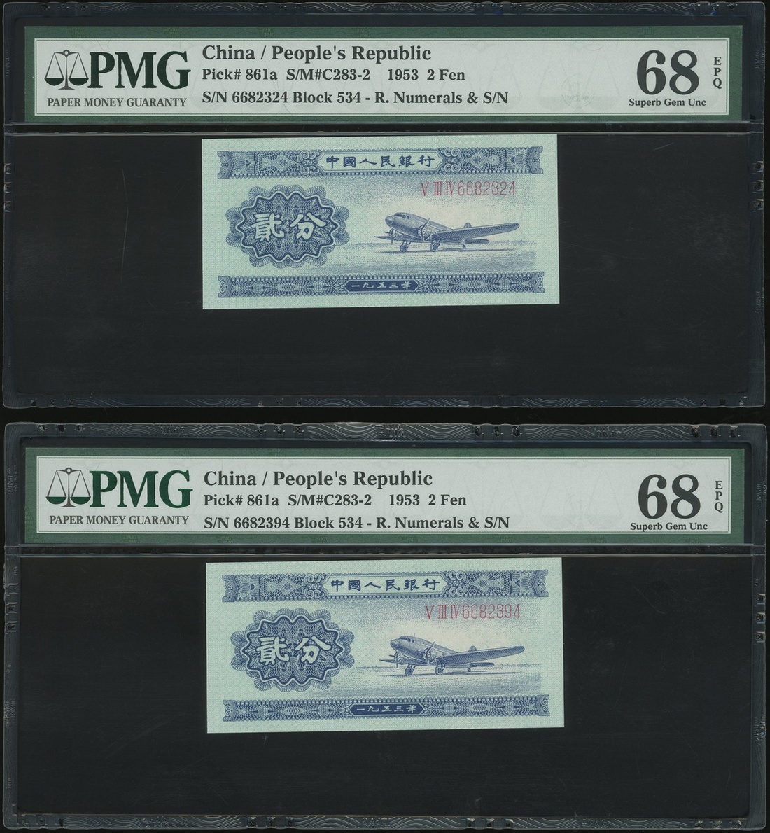 1953年中國人民銀行第二版人民幣2分一對,編號V III IV 6682324及V III IV 6682394,均PMG 68EPQ