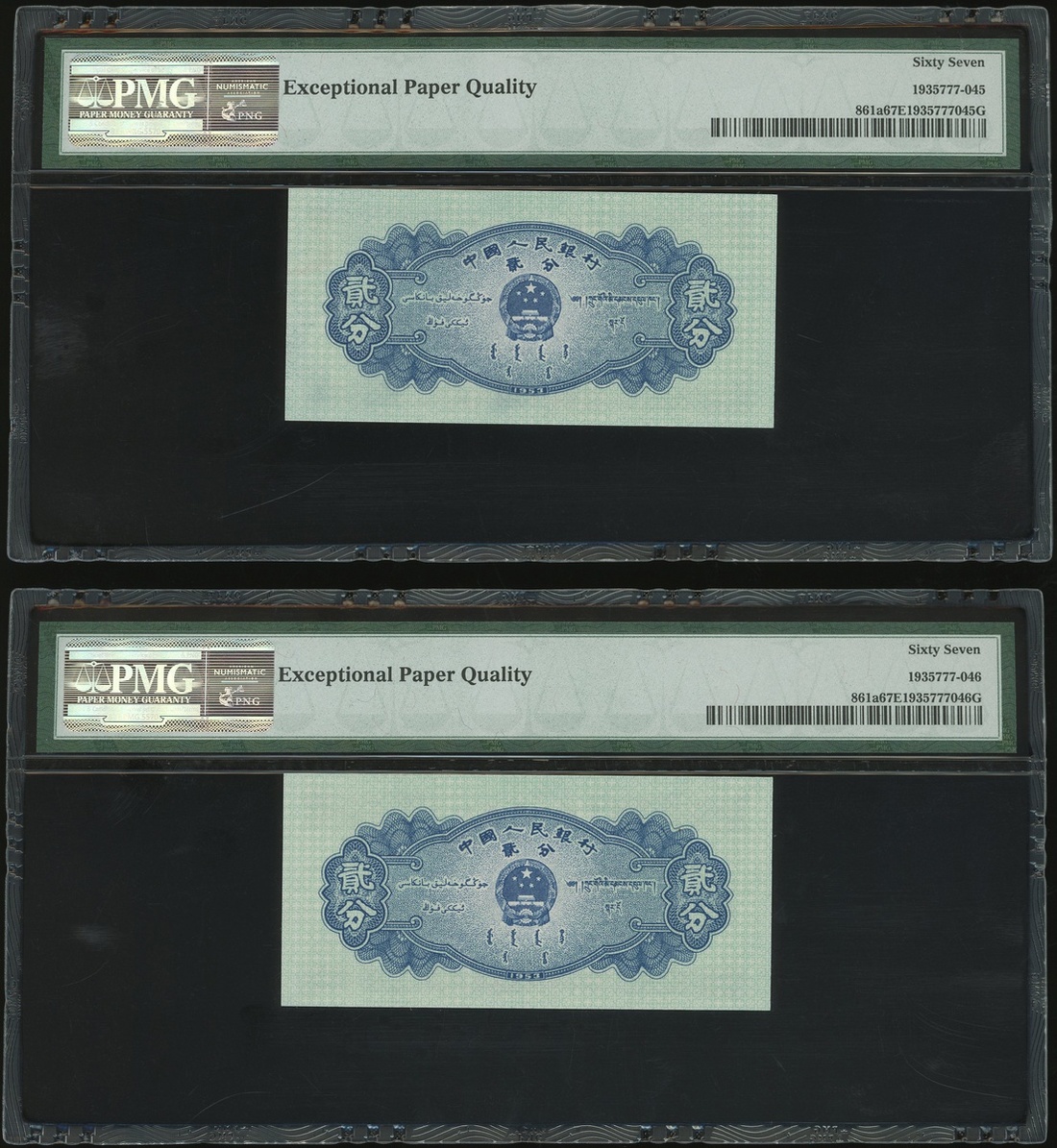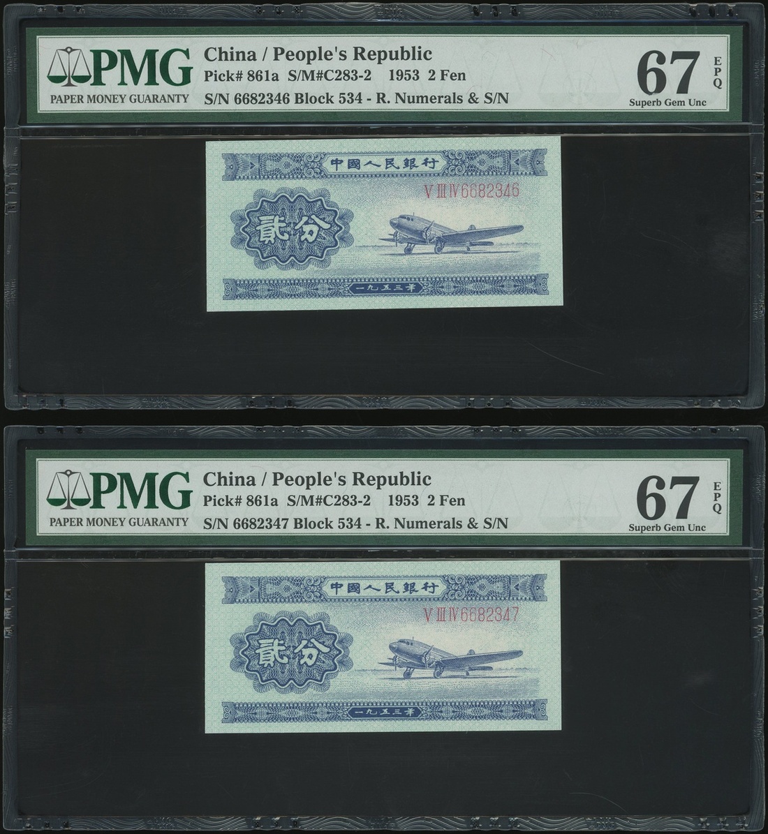 1953年中國人民銀行第二版人民幣2分一對,連號V III IV 6682346-47,均PMG 67EPQ