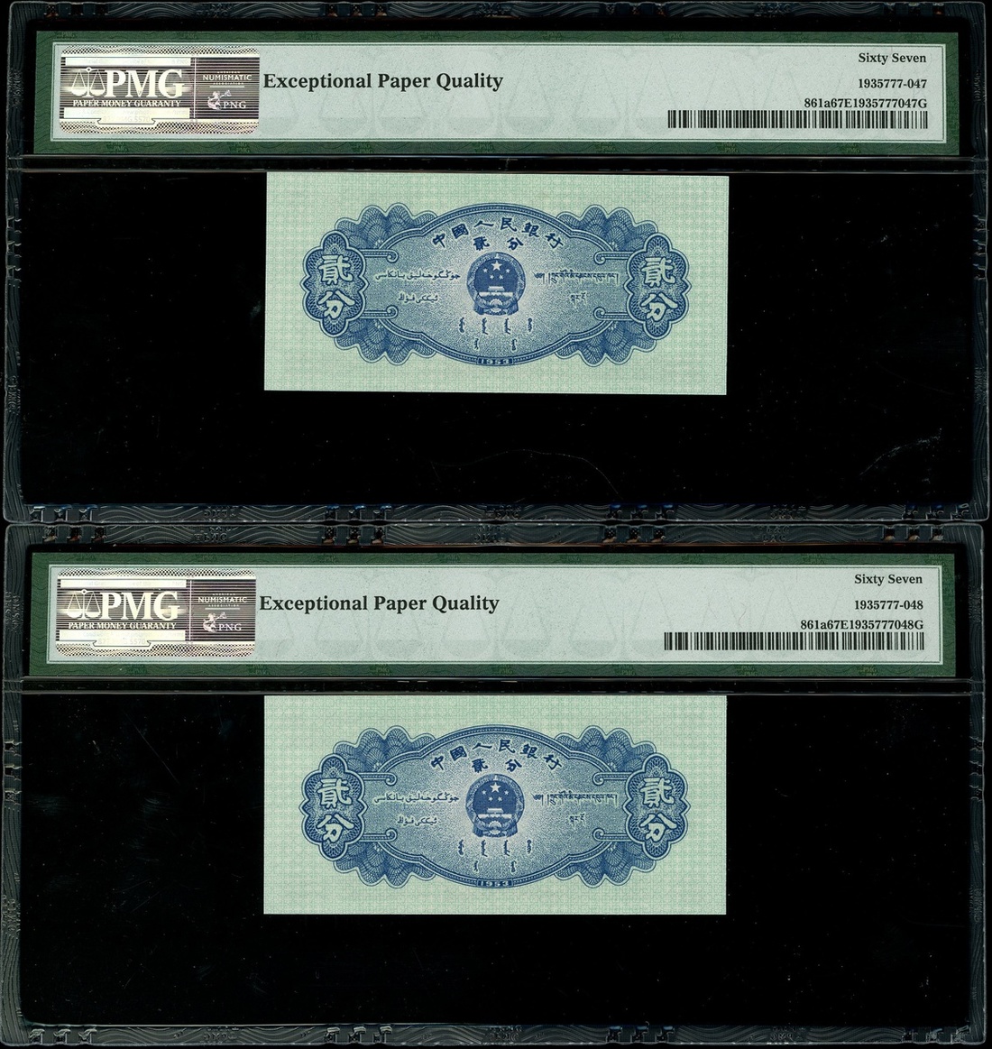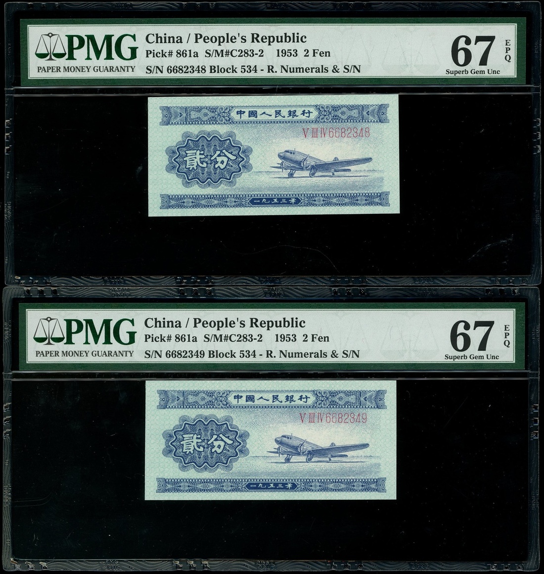 1953年中國人民銀行第二版人民幣2分一對,連號V III IV 6682348-49,均PMG 67EPQ