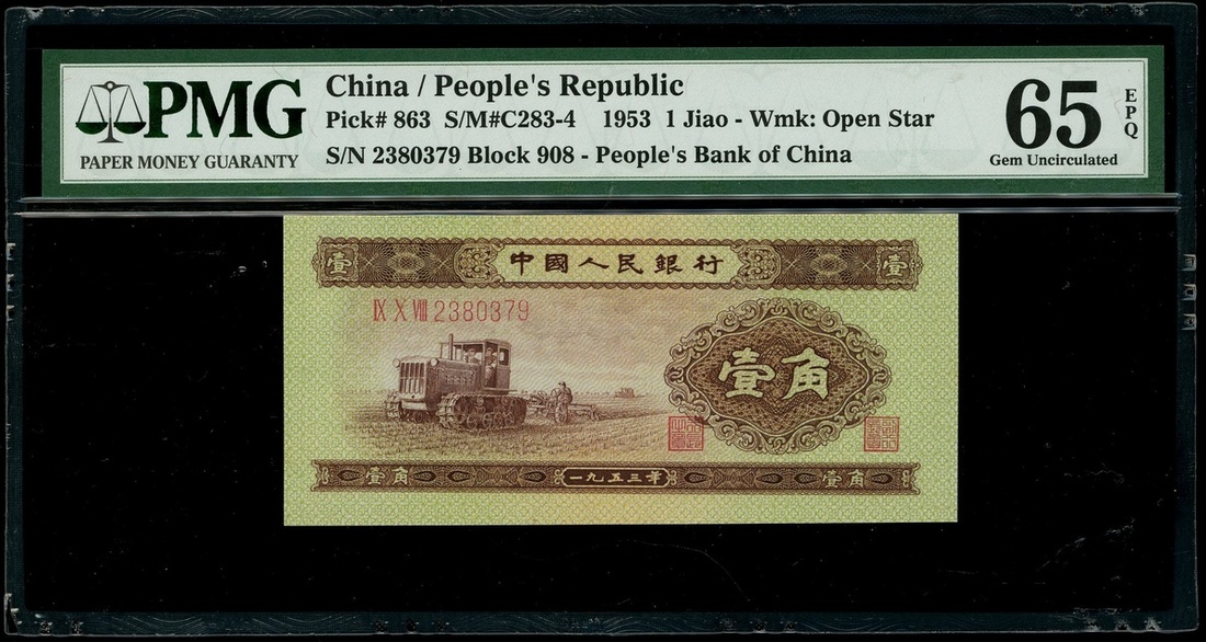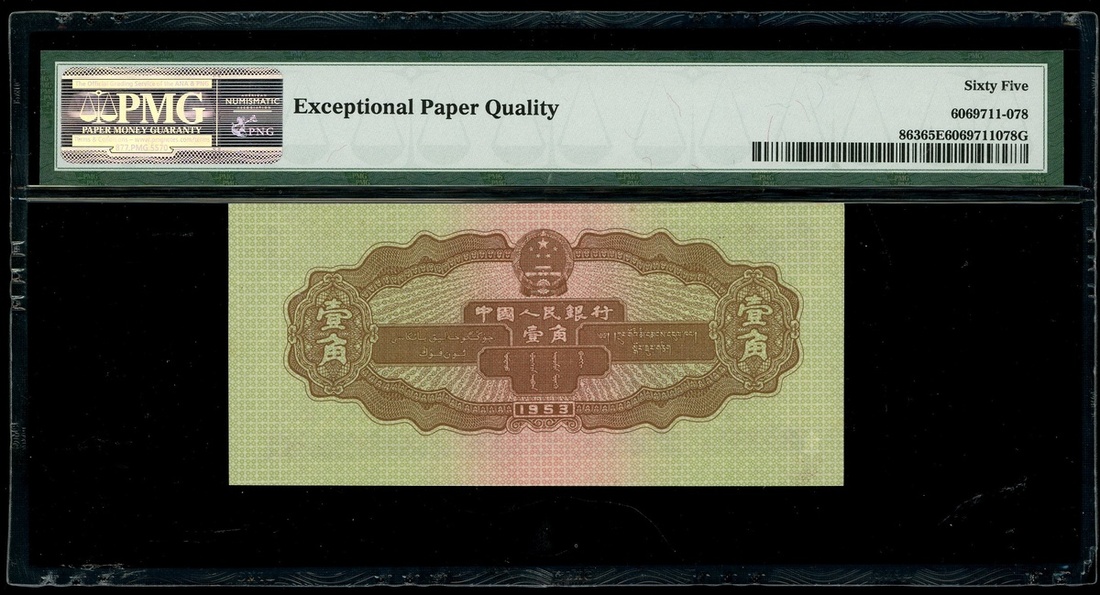 1953年中國人民銀行第二版人民幣1角,編號IX X VIII 2380379,PMG 65EPQ