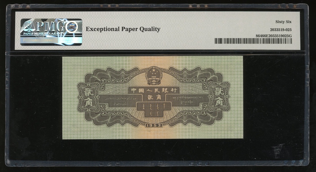 1953年中國人民銀行第二版人民幣2角,編號VII IX I 0133979,星水印,PMG 66EPQ