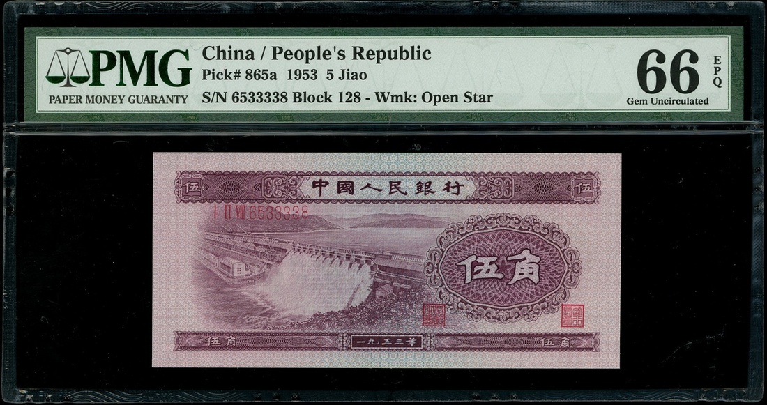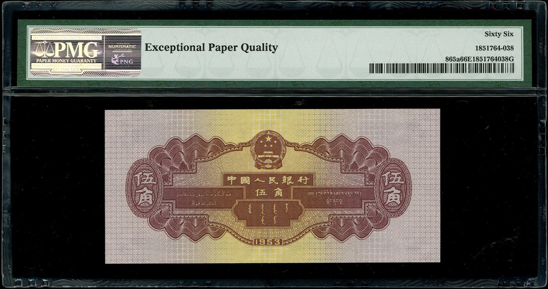 1953年中國人民銀行第二版人民幣5角,編號I II VIII 6533338,星水印,PMG 66EPQ