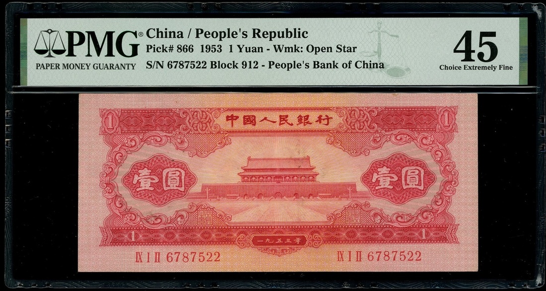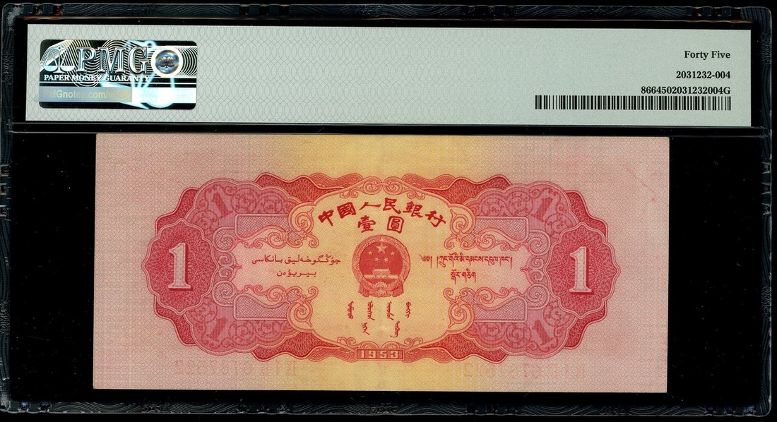 1953年中國人民銀行第二版人民幣1元,編號IX I II 6787522,PMG 45,佳品