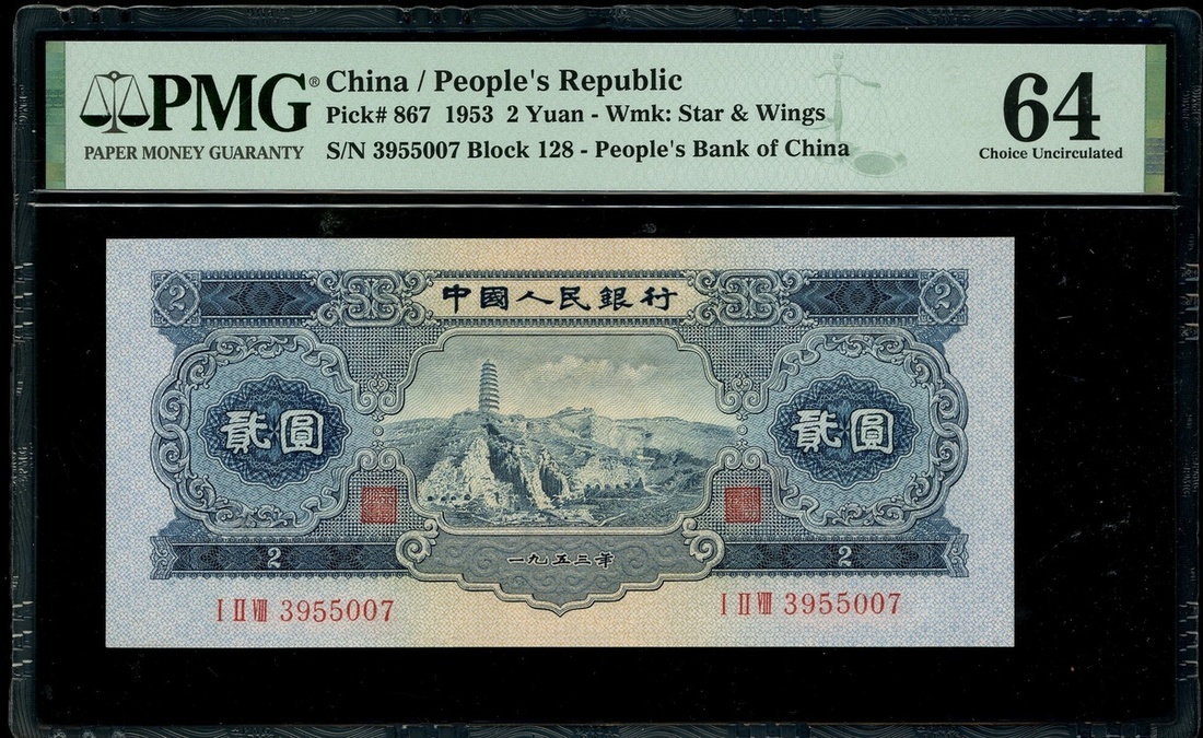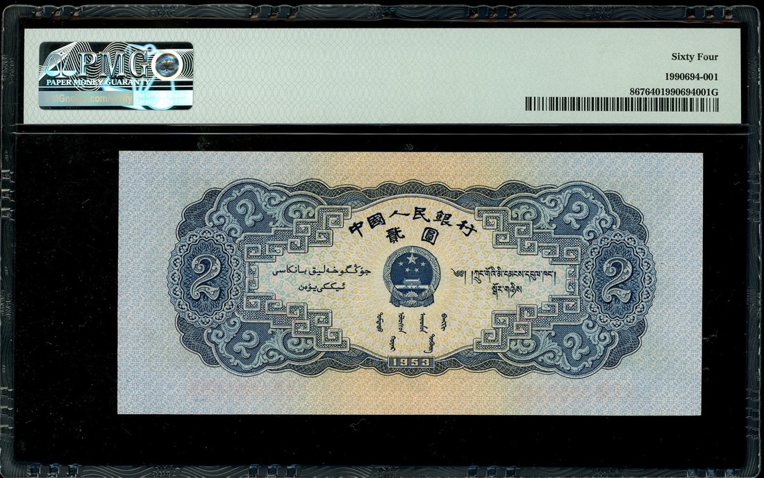 1953年中國人民銀行第二版人民幣2元,編號I II VIII 3955007,PMG 64