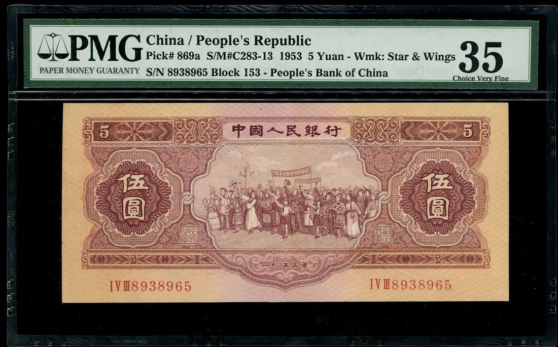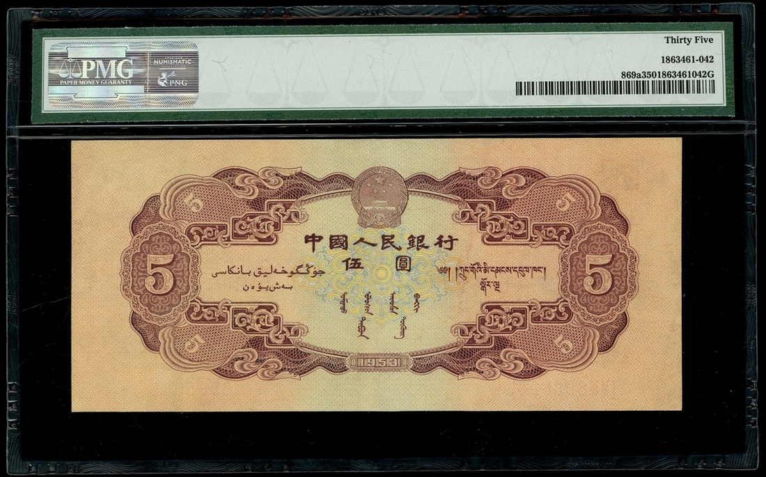 1953年中國人民銀行第二版人民幣5元,編號I V III 8938965,海鷗水印,PMG 35