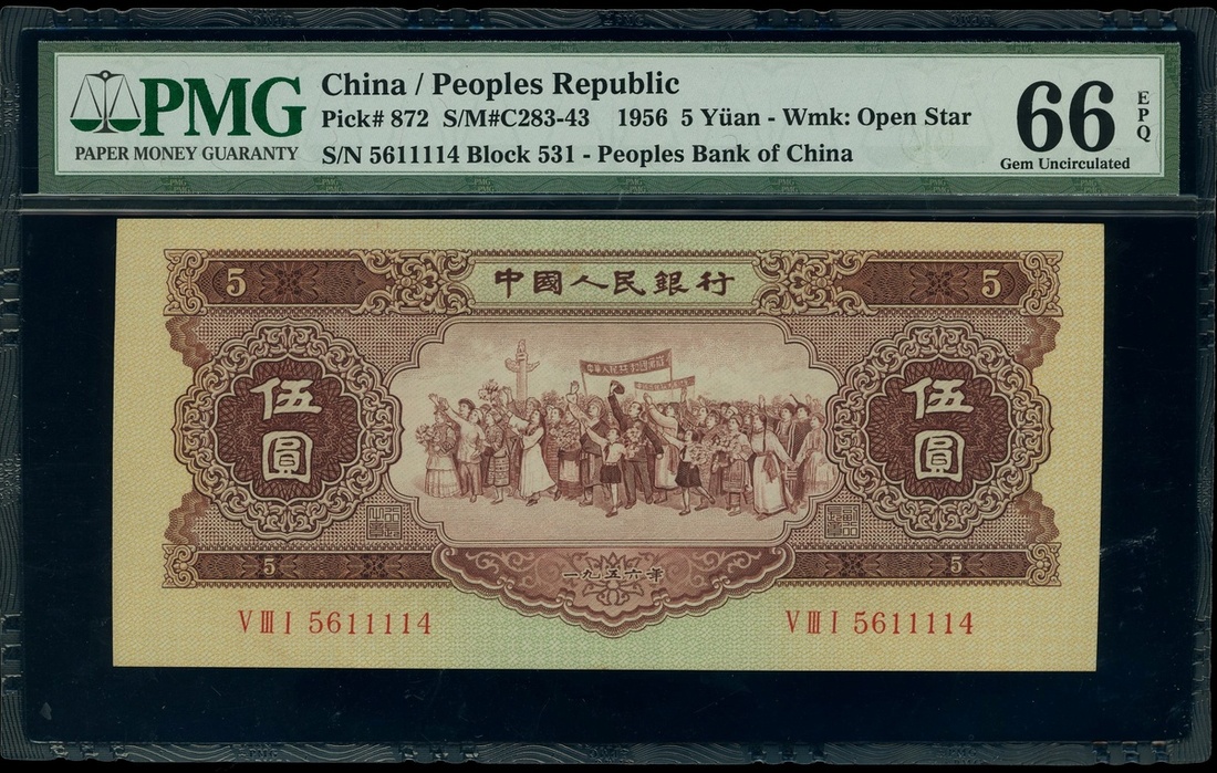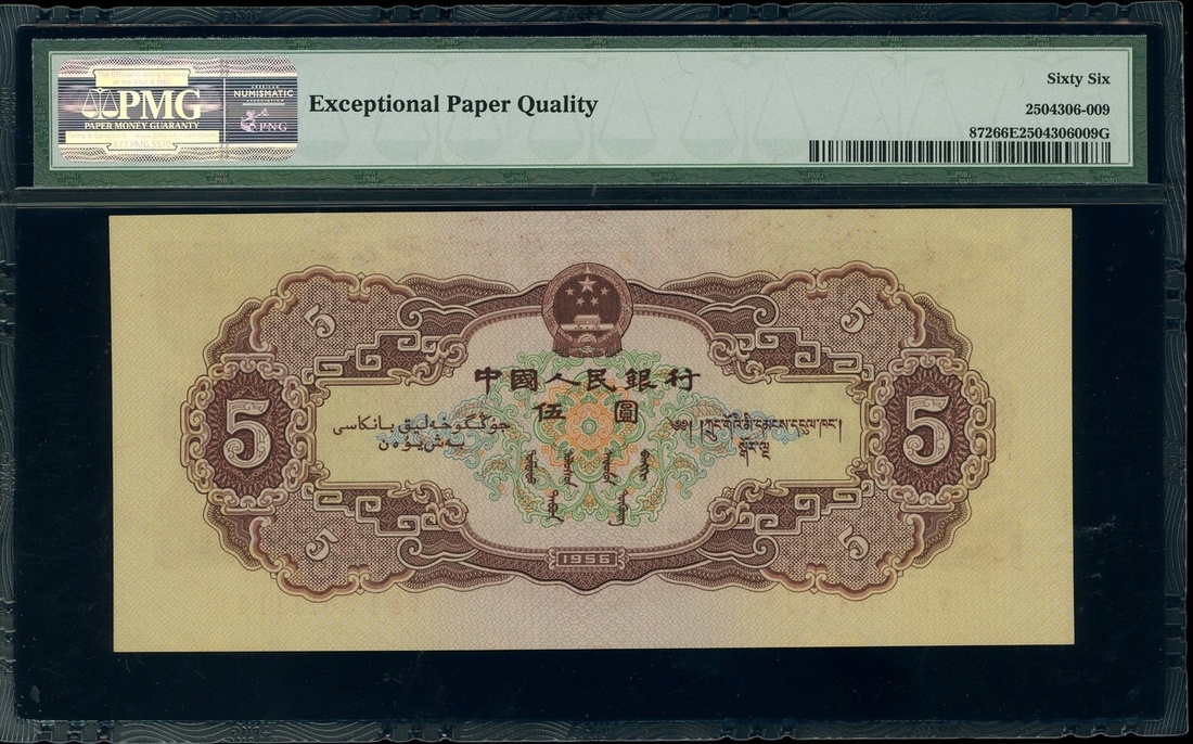 1956年中國人民銀行第二版人民幣5元,編號V III I 5611114,星水印,PMG 66EPQ