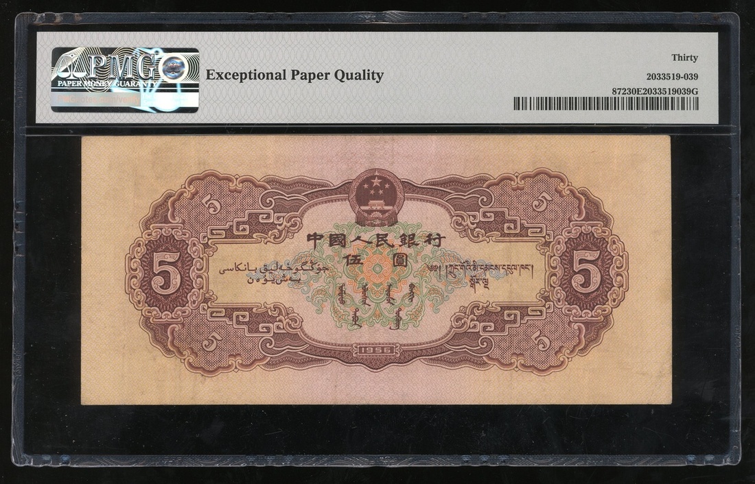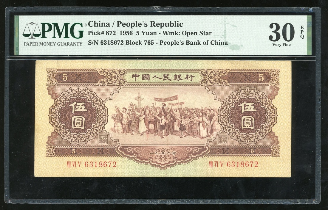 1956年中國人民銀行第二版人民幣5元,編號VII VI V 6318672,星水印,PMG 30EPQ