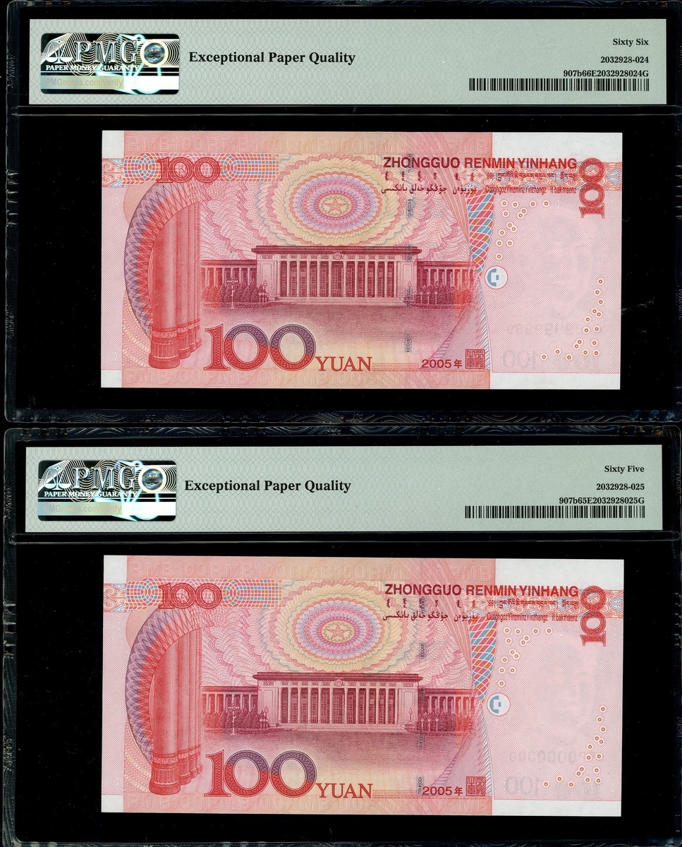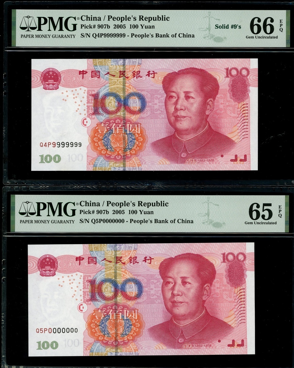 2005年中國人民銀行第五版人民幣100元2枚一組,連號Q4P9999999及Q5P0000000,分別評PMG 66EPQ及65EPQ