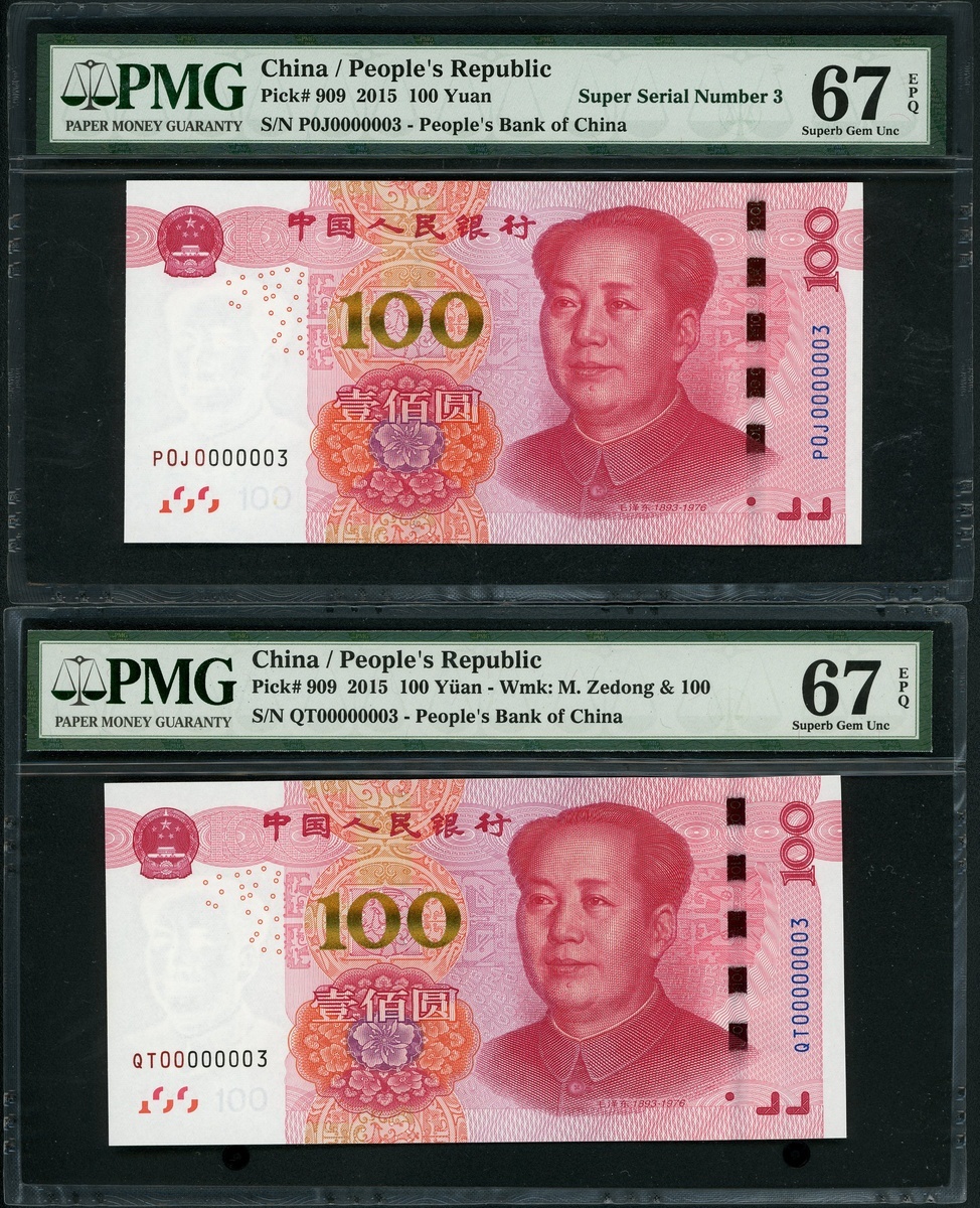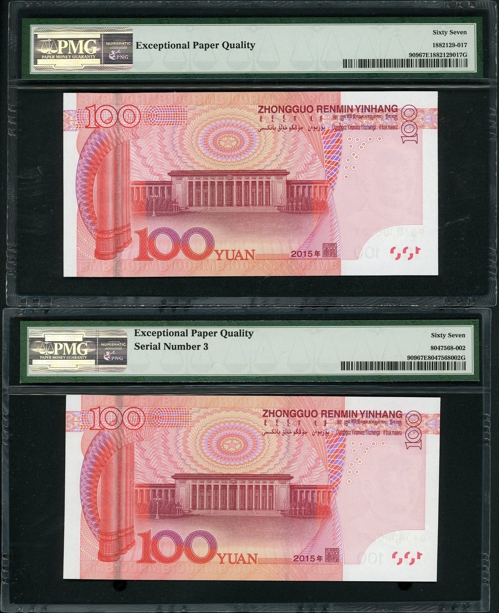 People's Bank of China, 5th series renminbi, 2015, a pair of 100 Yuan, matching low serial numbers P0J0000003 and QT00000003,