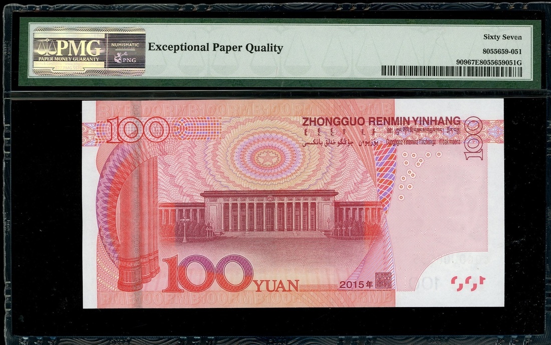 2015年中國人民銀行第五版人民幣100元,細號C0G0000055,PMG 67EPQ