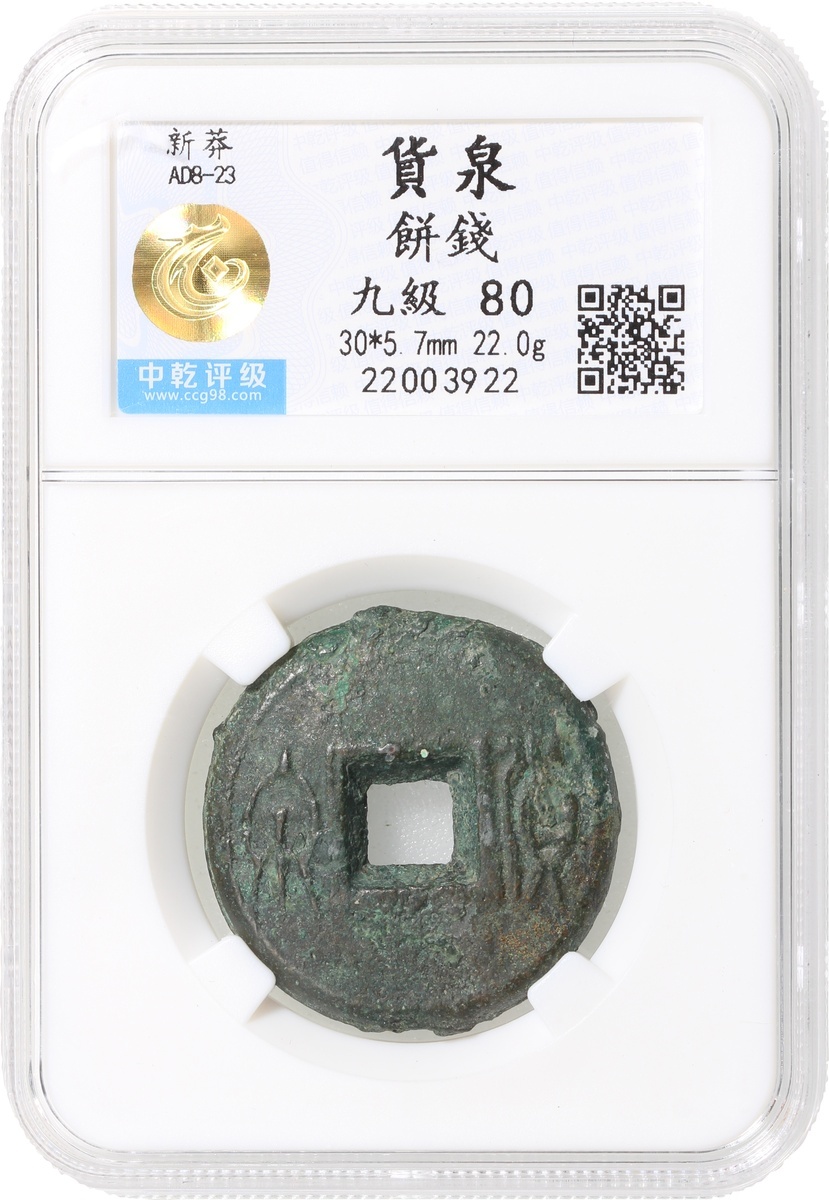 新莽貨泉餅錢,尺寸30x5.7厘米, 22.0克, 中乾評級80,編號22003922
