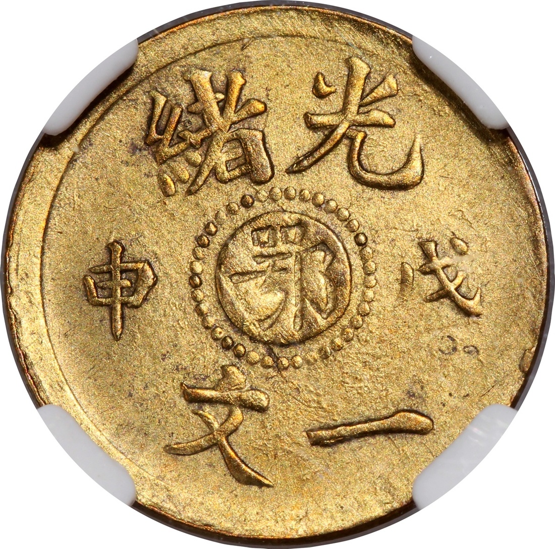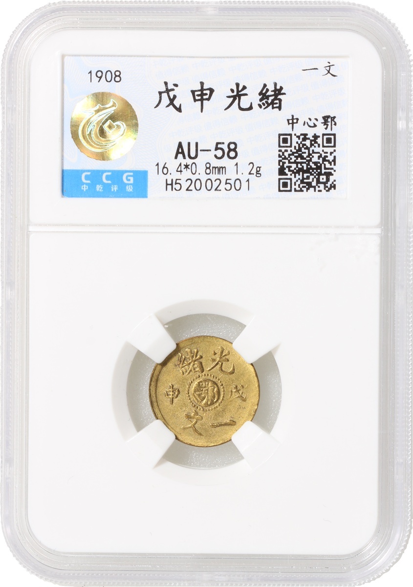 清代光緒戊申中心鄂一文黃銅,中乾評級AU58,編號H52002501