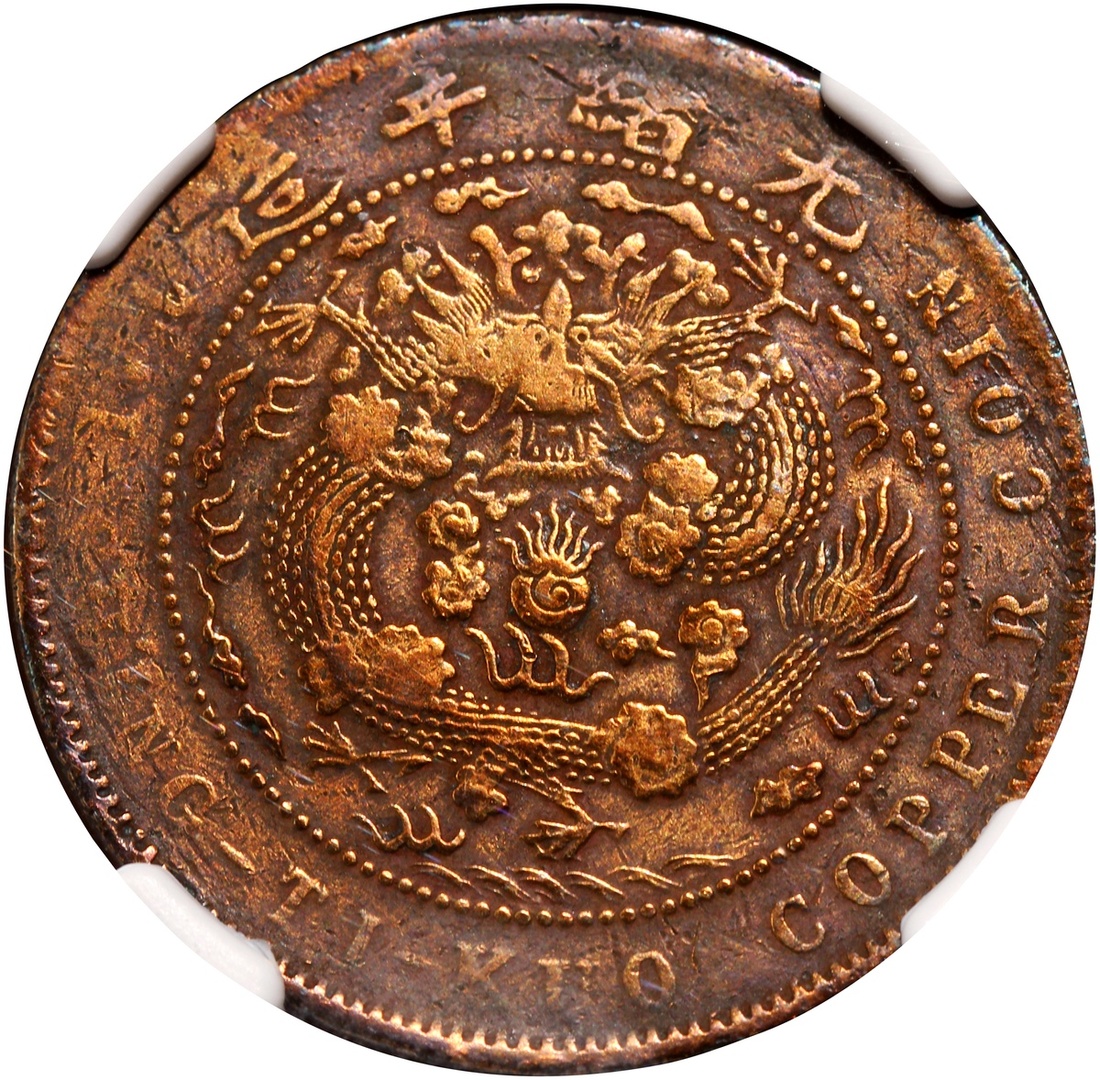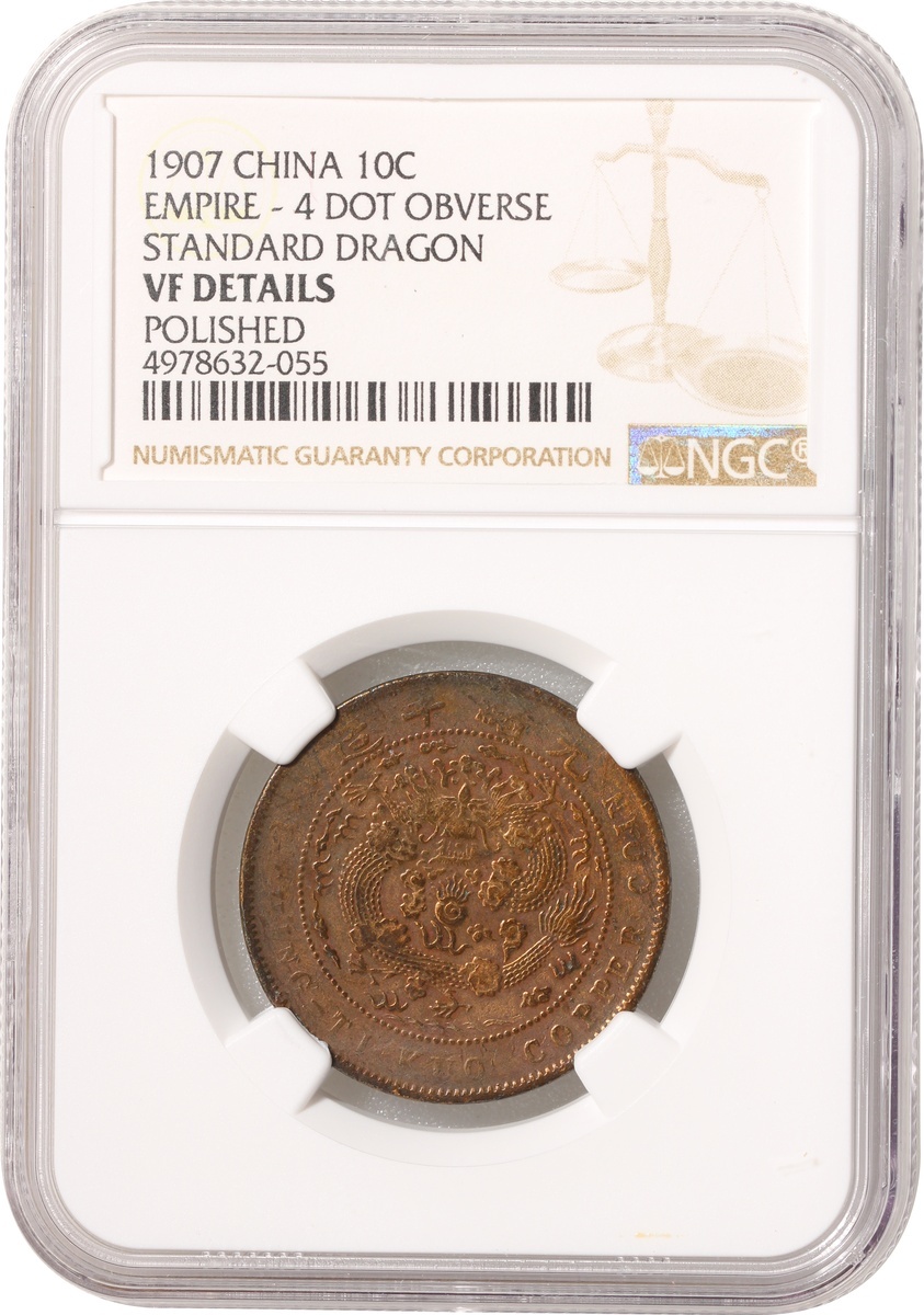 Qing Empire, copper 10 cash, 1907, 4 dot obverse, standard dragon, NGC VF details, polished, #4978632-055.