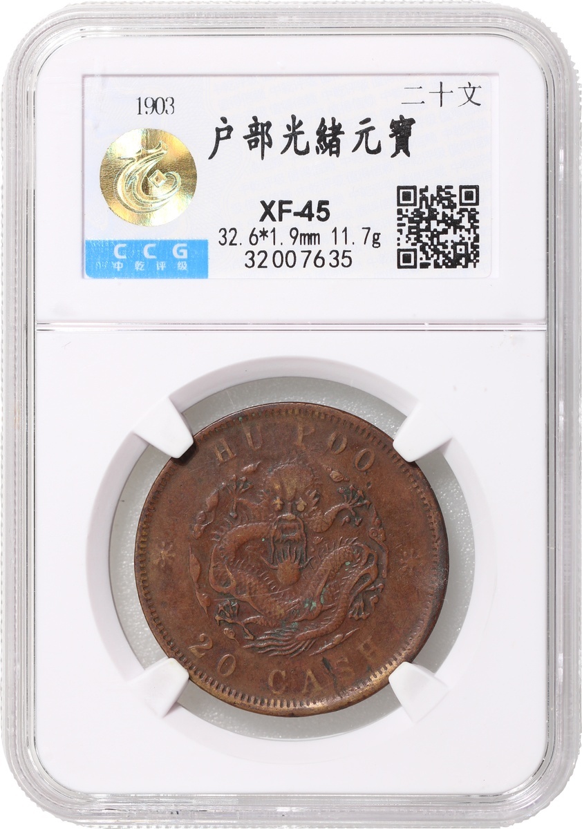 Qing Dynasty, copper 20 cash, ND (1903), Hu Poo mint, 'Guangxu Yuan Bao', Zhong Qian XF45