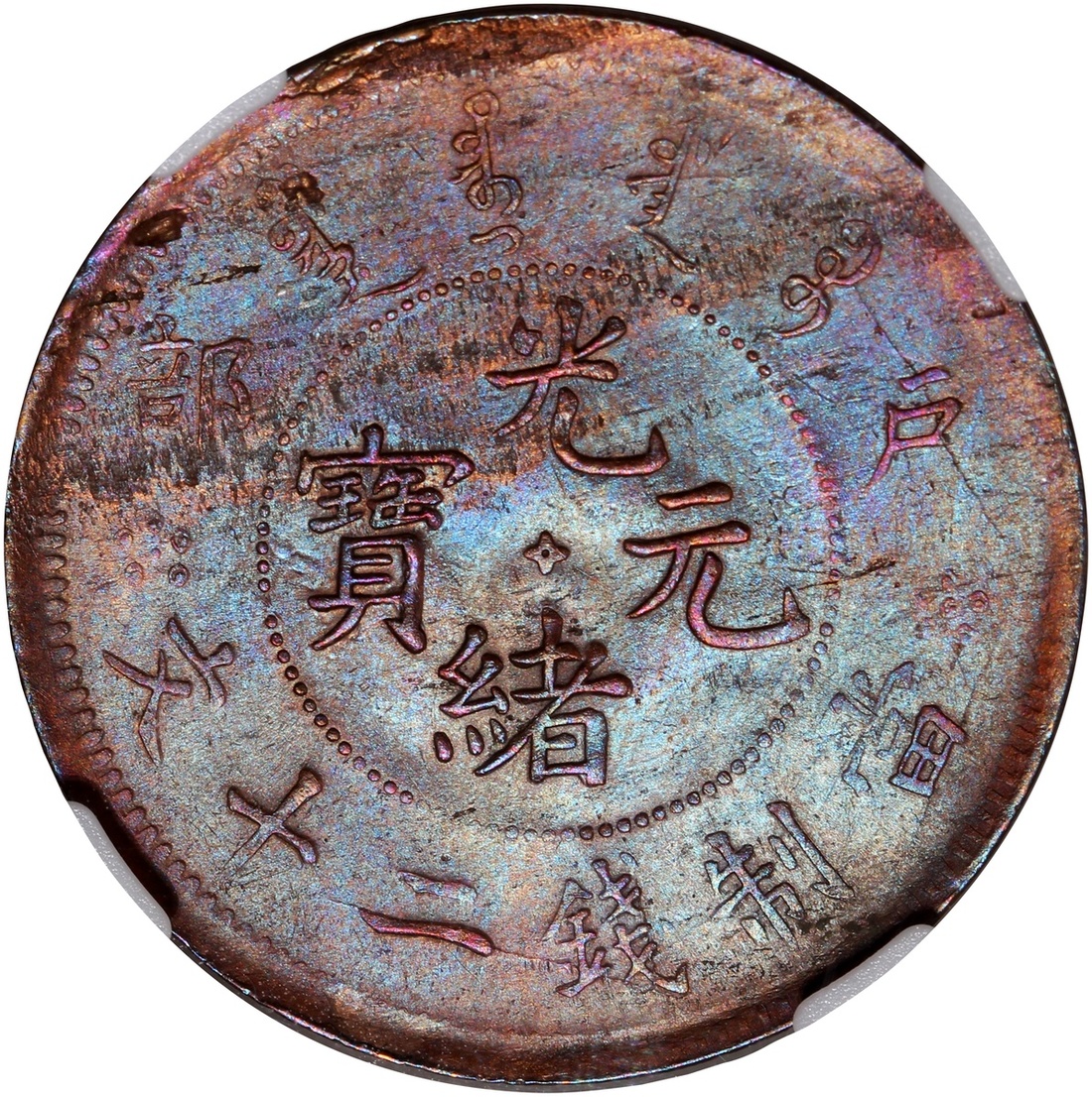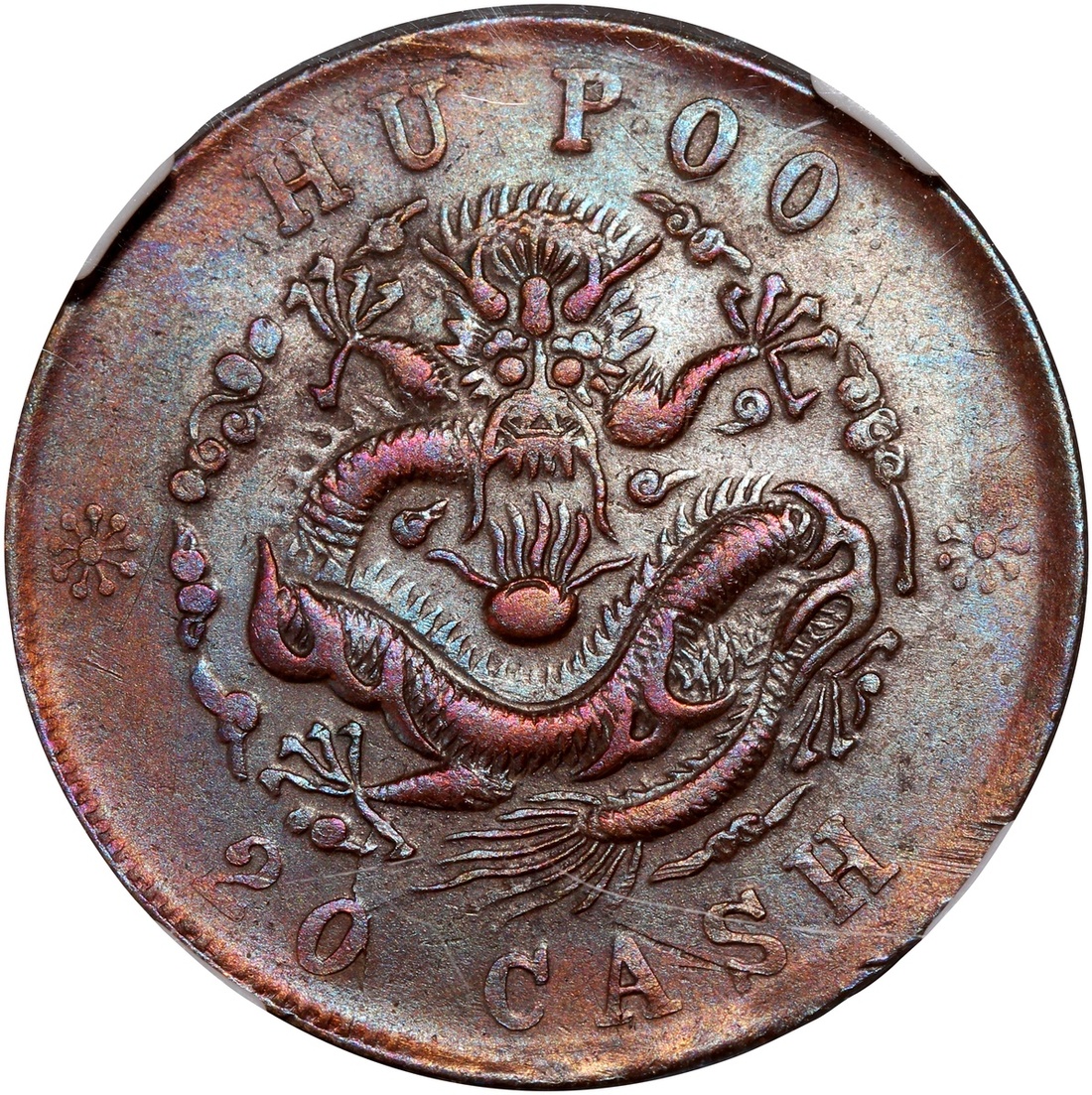 Qing Dynasty, copper 20 cash, 'Guangxu Yuan Bao', no date (1903), Hu Poo Mint, star at centre, Zhong Qian AU58, #H52003114.
