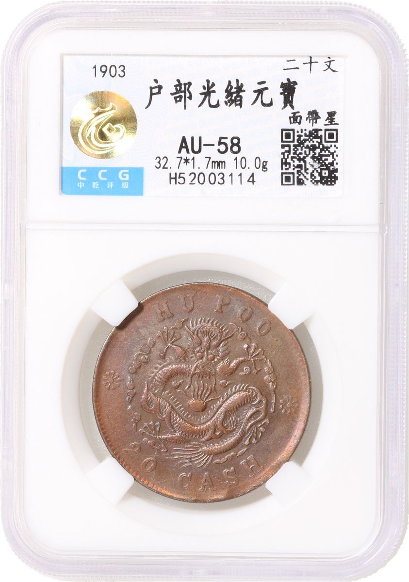 清代戶部光緒二十文,中乾評級AU58,編號H52003114