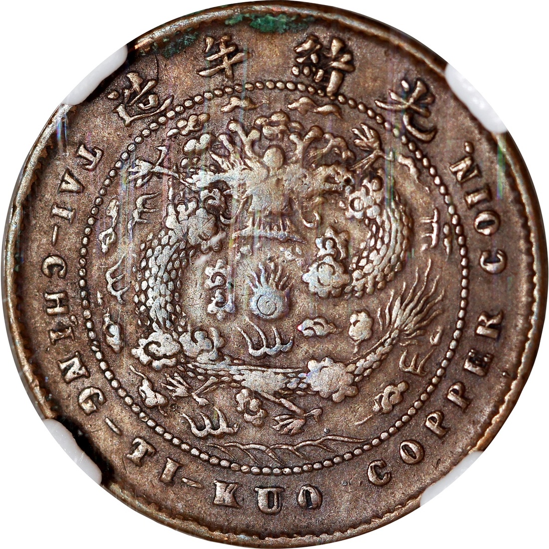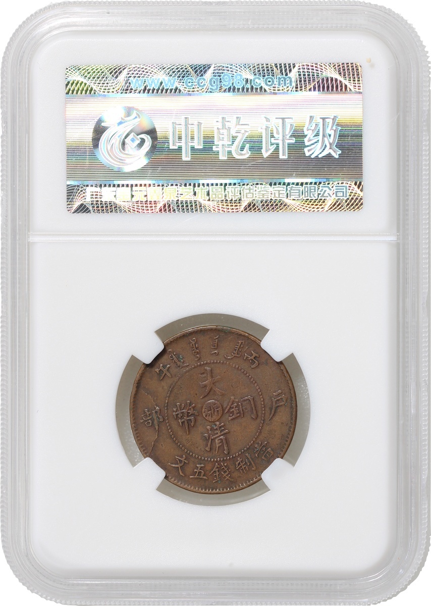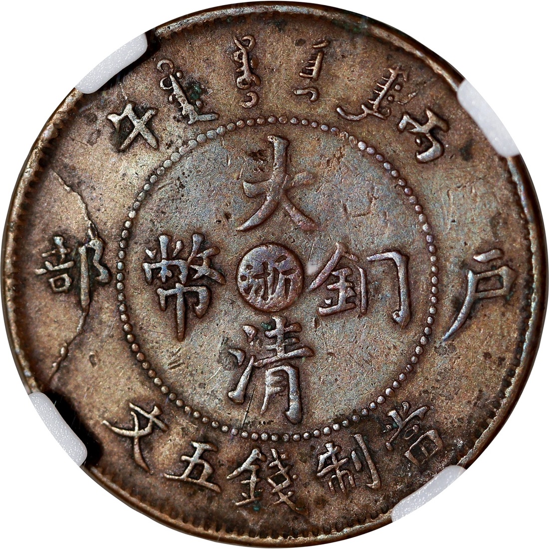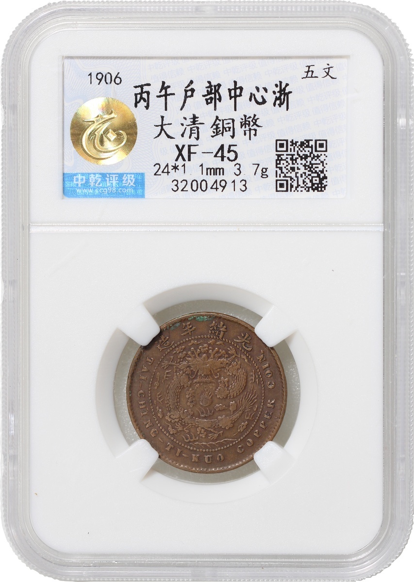Republic of China, Chekiang Province, copper 5 cash, Bingwu year (1906), Hu Poo mint, 'Da Qing Tong Bi', 'Zhe' character at centre, Zhong Qian XF45