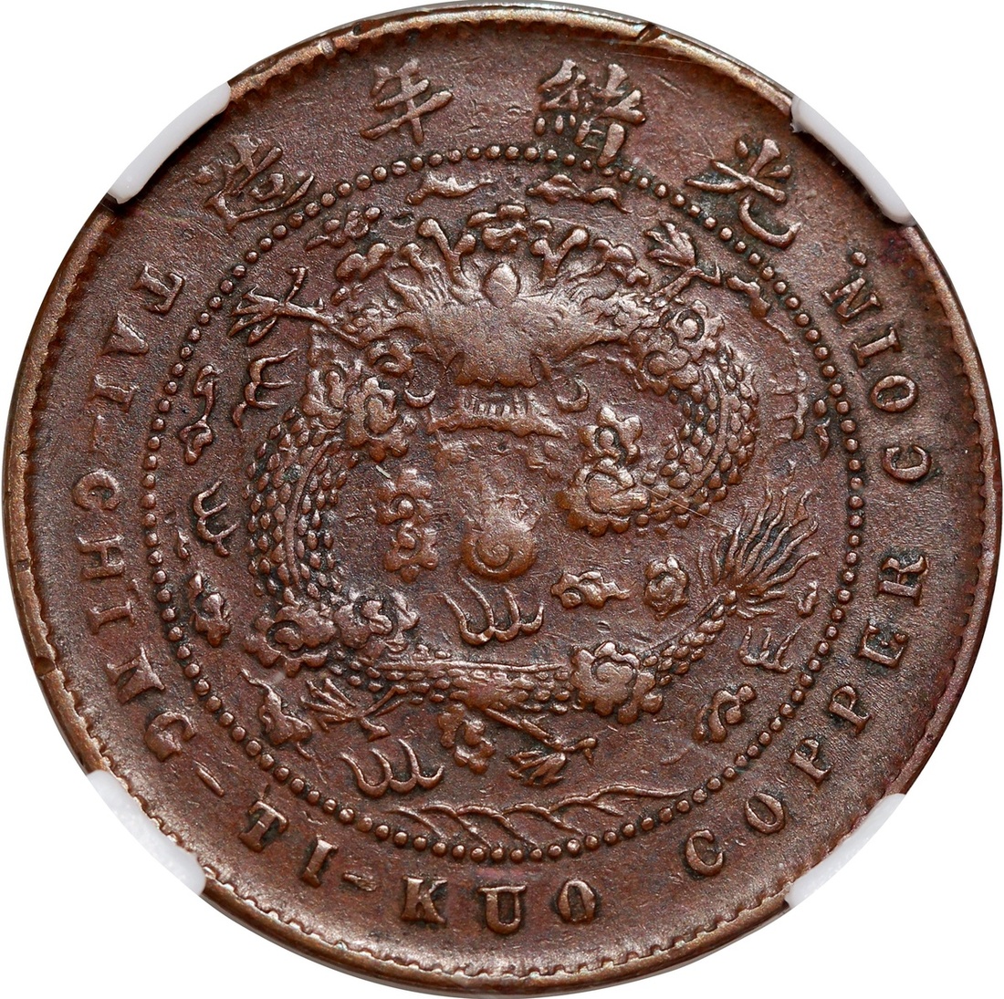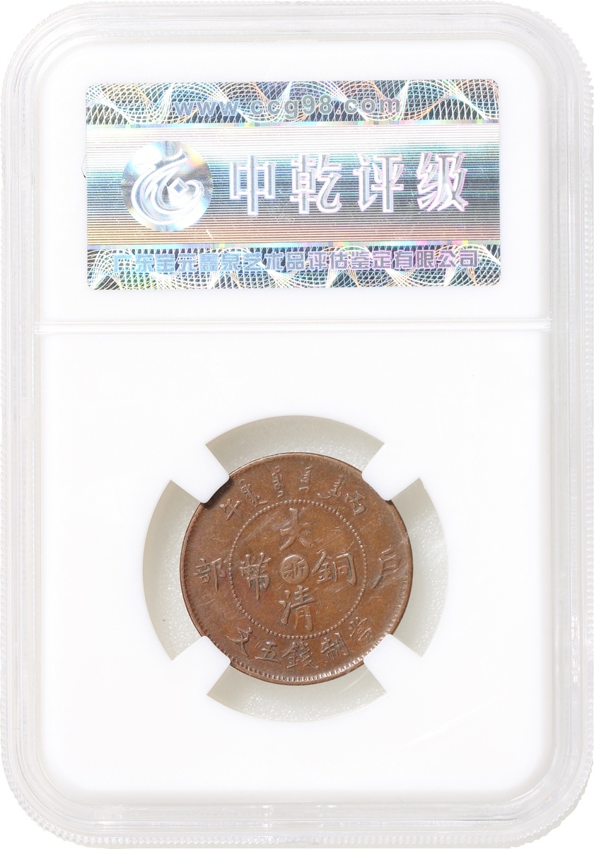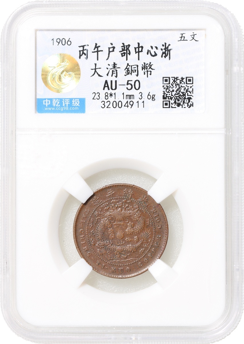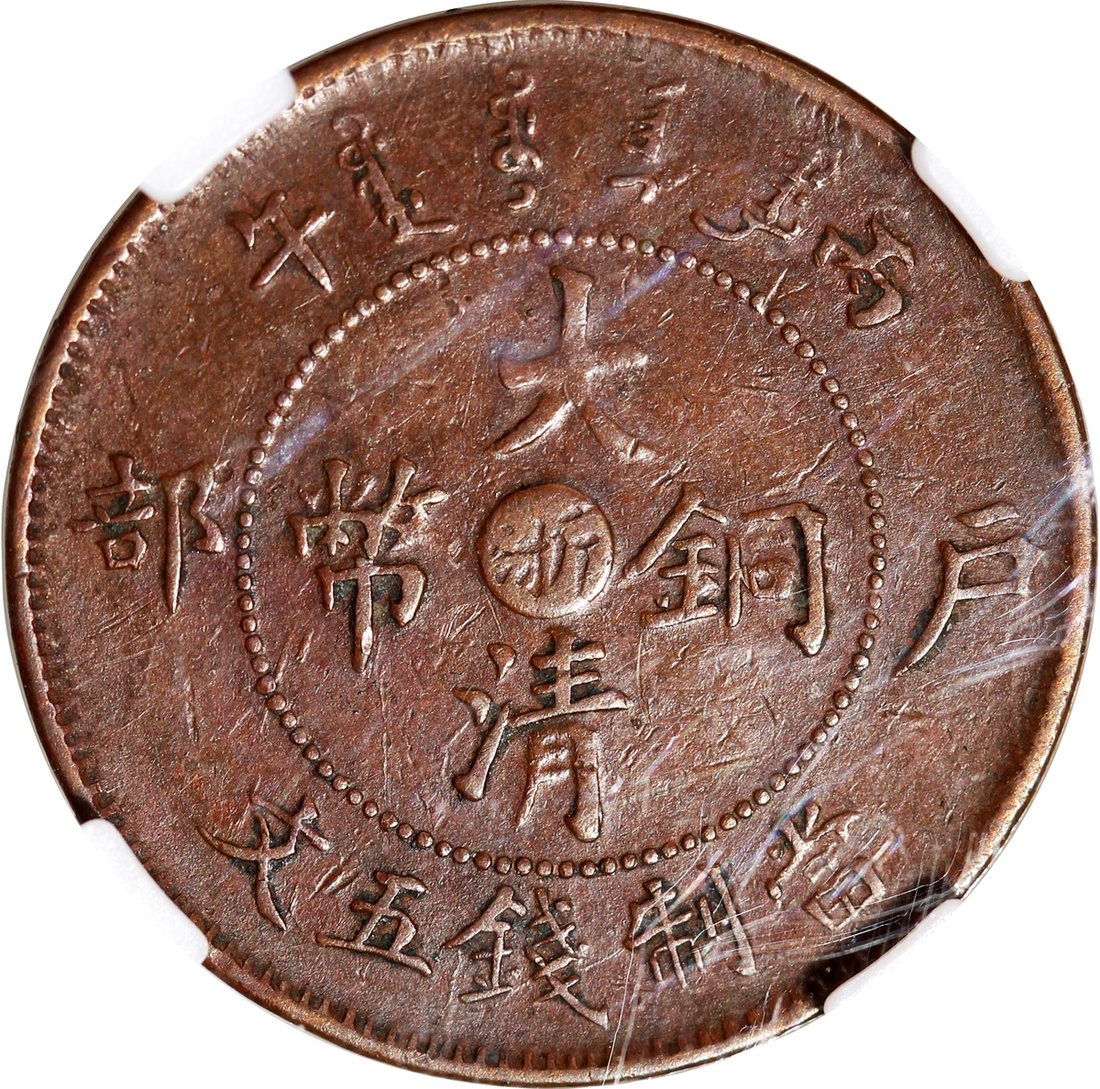 Republic of China, Chekiang Province, copper 5 cash, Bingwu year (1906), Hu Poo mint, 'Da Qing Tong Bi', 'Zhe' character at centre, Zhong Qian AU50