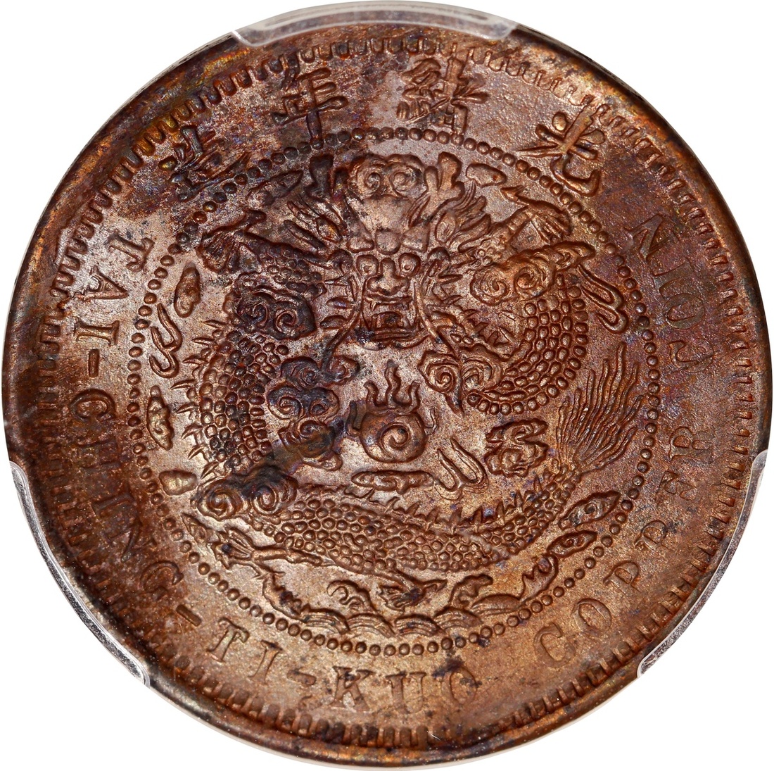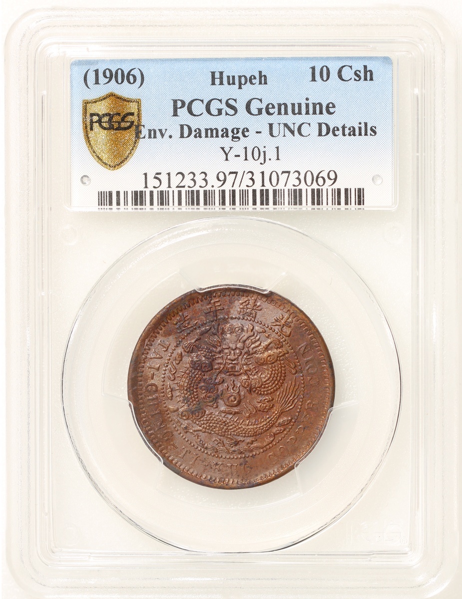 Hupeh Province, copper 10 cash, Bingwu Year (1906), Hu Poo Mint, 'Da Qing Tong Bi', 'E' character at centre, (Y-10j.1), PCGS Genuine Environmental Damage - UNC Details