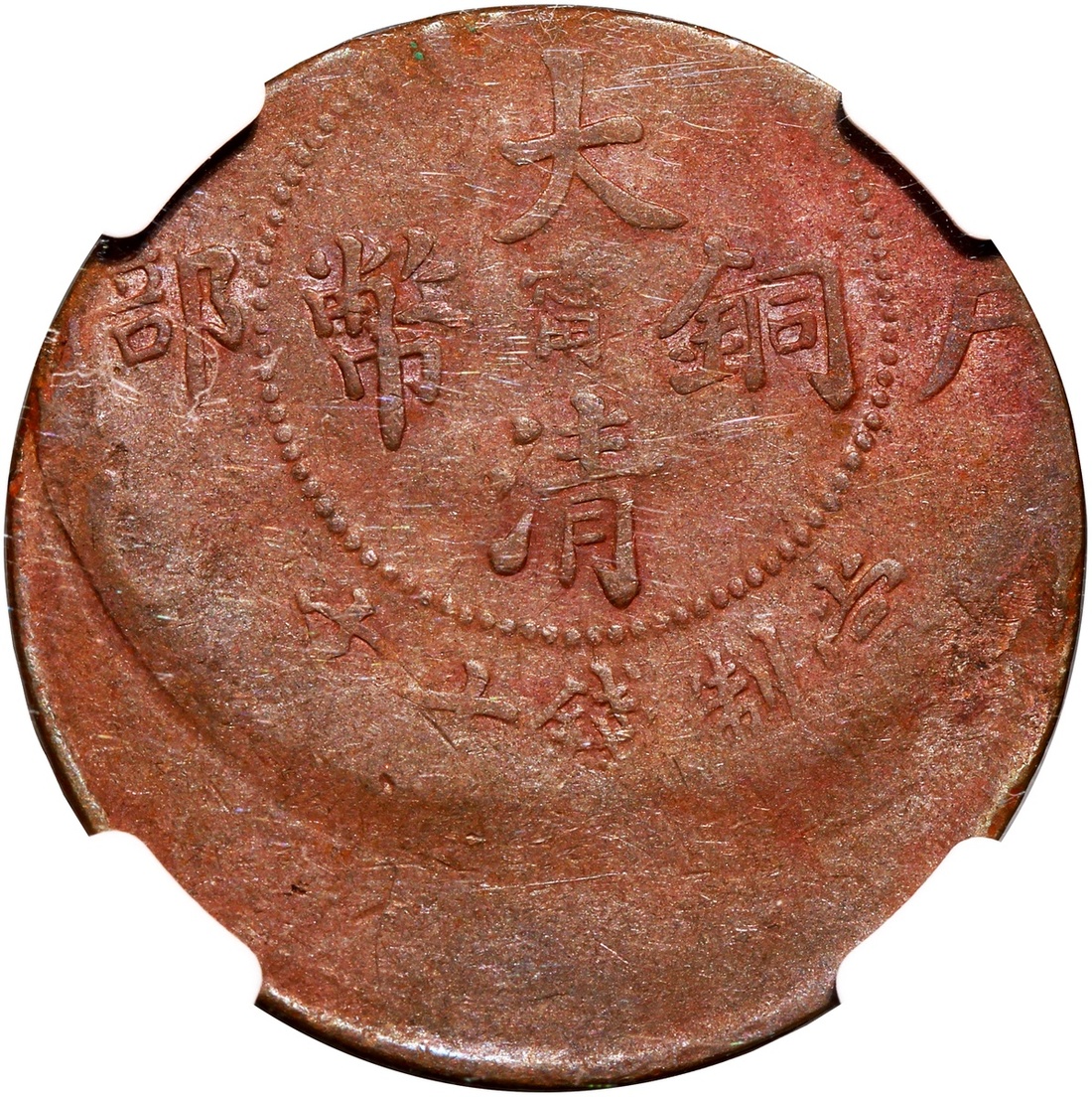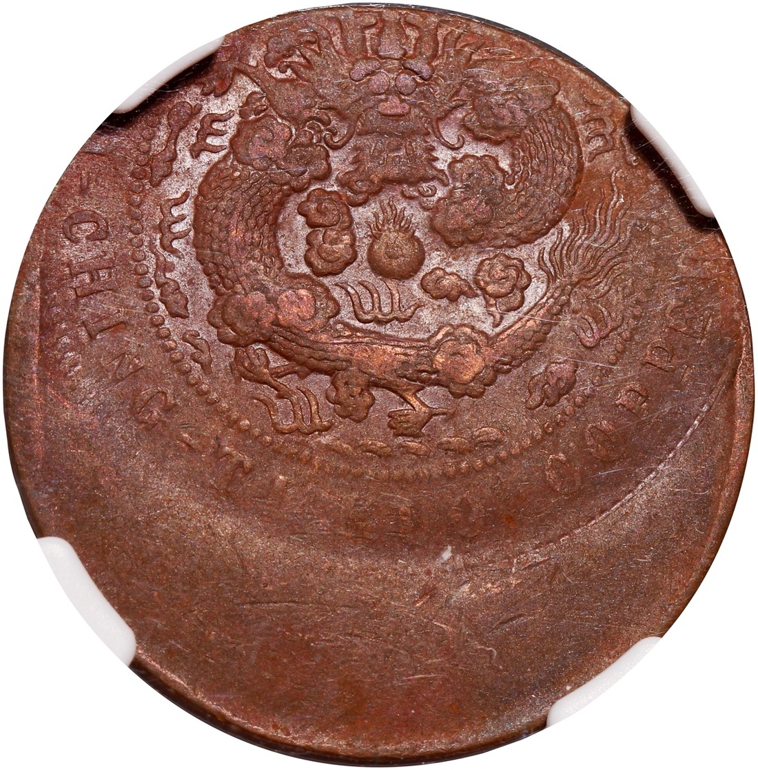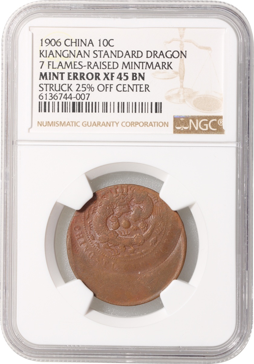 Qing Dynasty, copper 10 cash, Kiangnan standard dragon, Da Qing Tong Bi, mint error, struck 25% off centre, NGC Mint Error XF45 BN, rare seen. #6136744-007