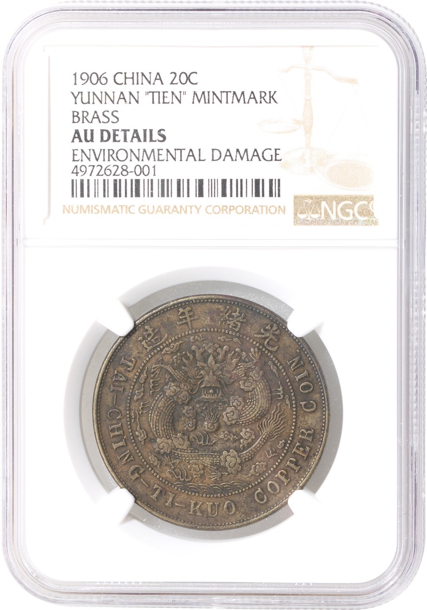 Yunann Province, brass 20 cash, 'Bingwu' Year (1906), Hu Poo Mint, 'Da Qing Tong Bi', 'Tian' character at centre, NGC AU Details (Environmental Damage), #4972628-001.