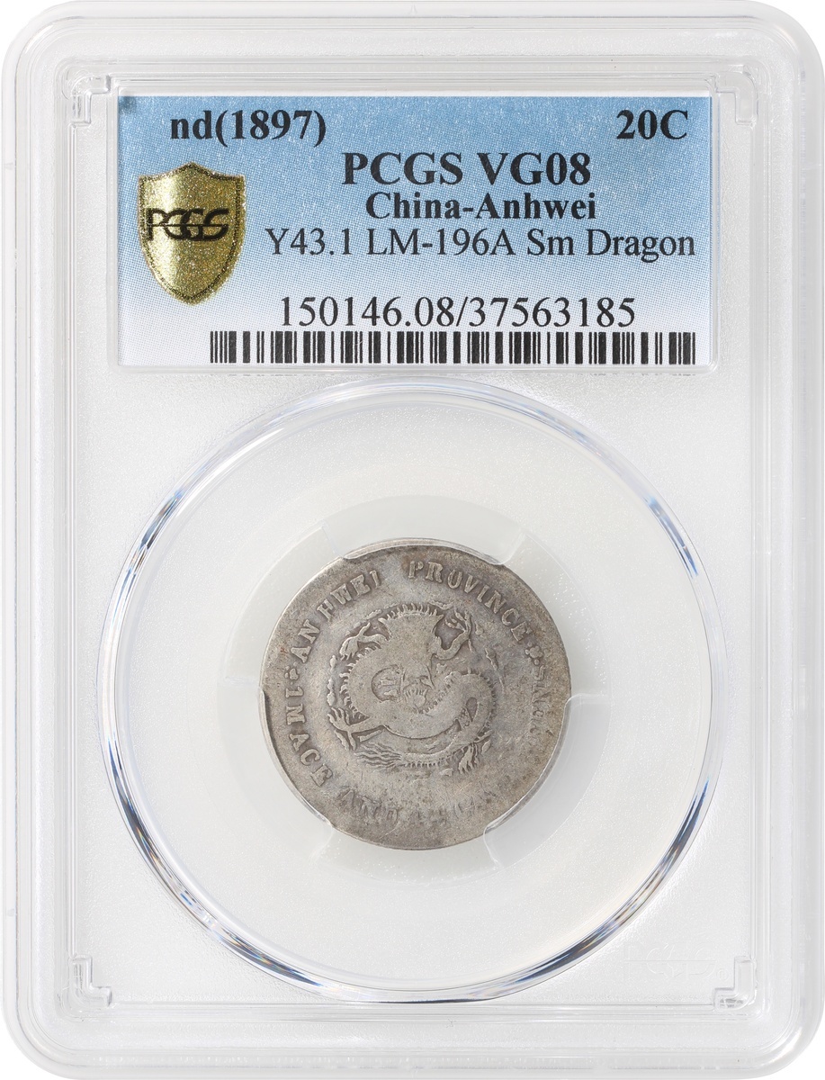 Anhwei Province, silver 20 cents, Guangxu Yuan Bao, small dragon variety, (LM-196A), PCGS VG08. #37563185