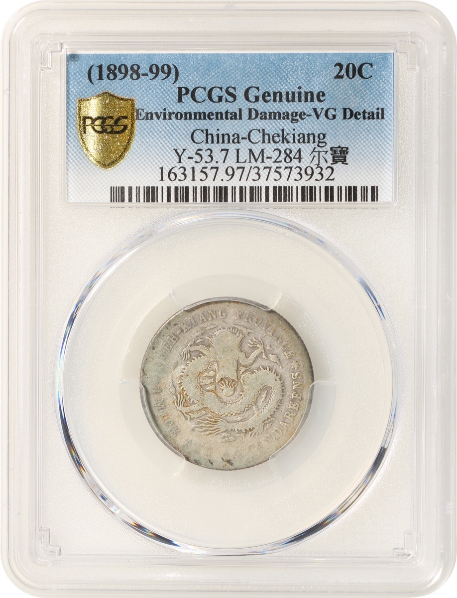 Chekiang Province, a pair of silver 10 and 20 cents, Guangxu Yuan Bao, (LM-285, 284), PCGS VG10 and VG Detail, environmental damage.(2) #37574088, 37573932