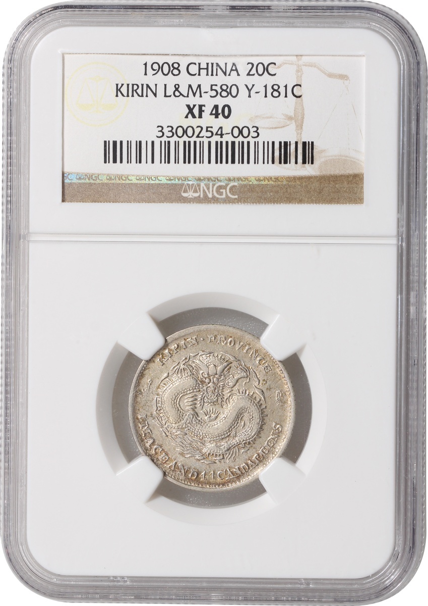 Kirin Province, silver 20 cents, Year Wushen '1908', 'Guangxu Yuan Bao', (LM-580, Y-181C), NGC XF40, #3300254-003.