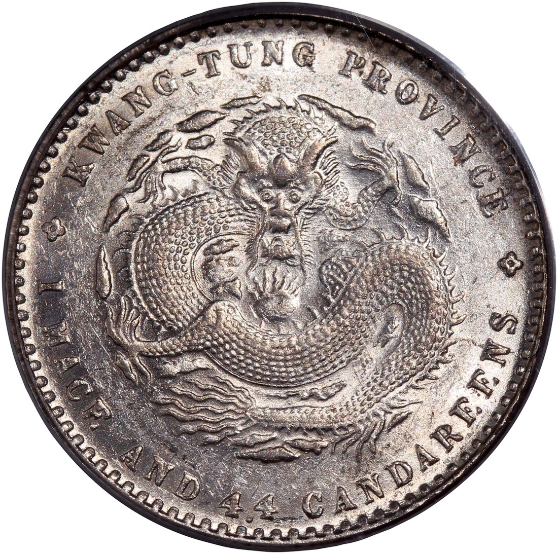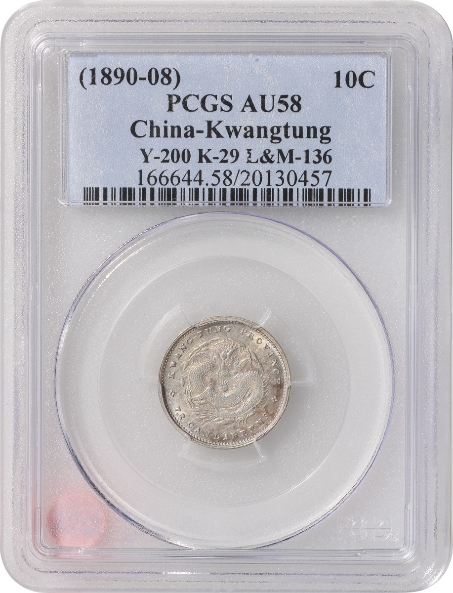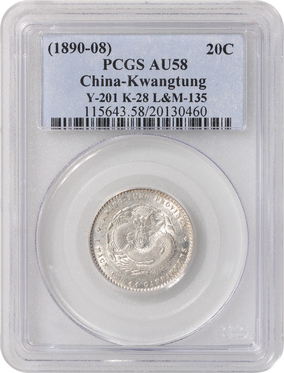 Kwangtung Province, a pair of silver 10 cents and 20 cents, 1890-08, 'Guangxu Yuan Bao', (Y-200, K-28, LM-135 and Y-201, K-29, LM-136), both graded PCGS AU58, #20130457 and #20130460. (2)
