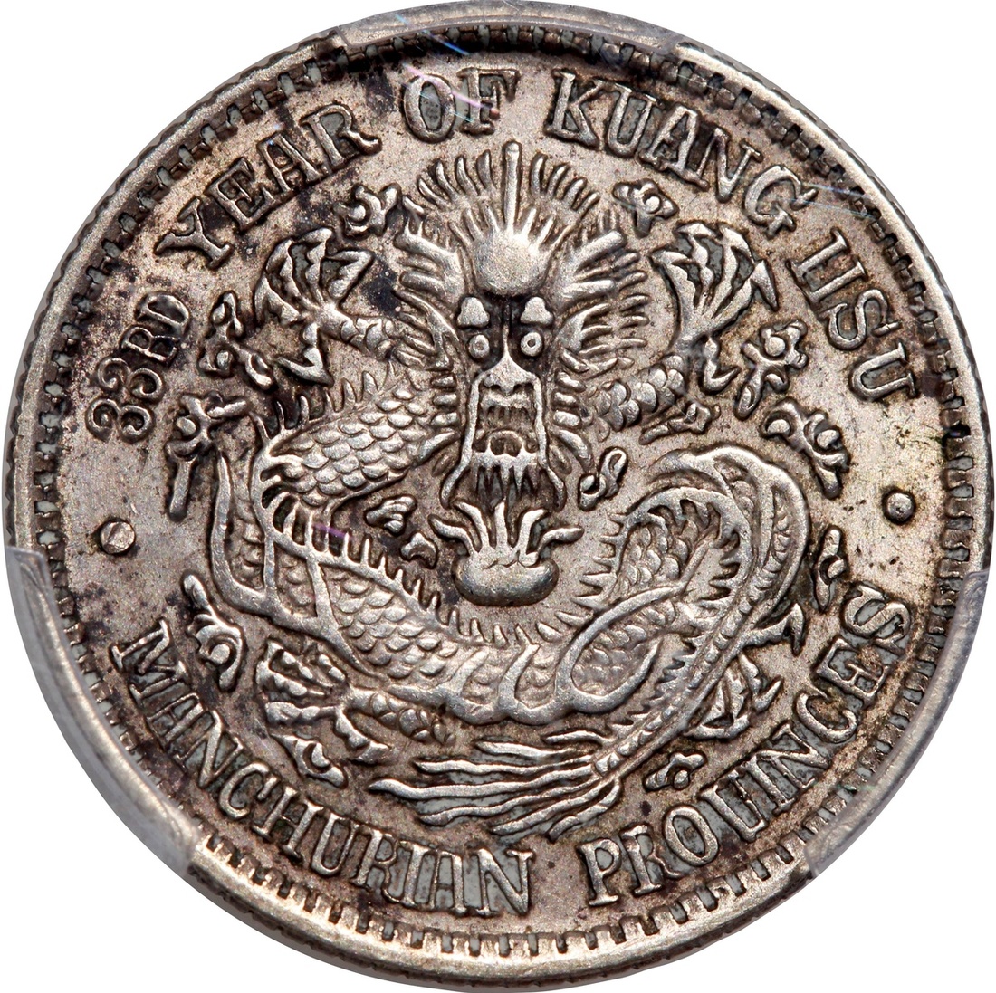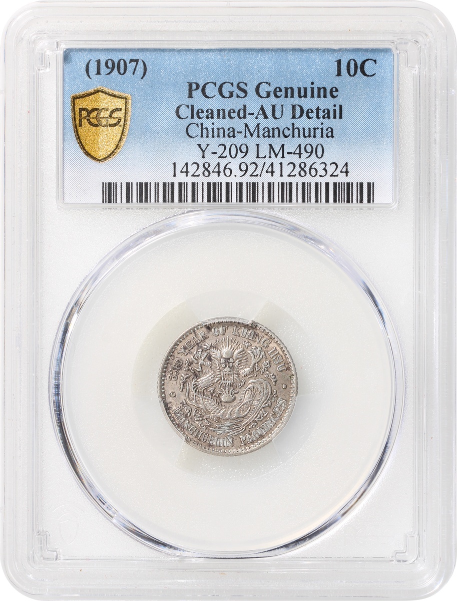 Manchuria Province, silver 10 cents, Guangxu Yuan Bao, 33rd Year of Kuang Hsu, (Y-209, LM-490), PCGS AU Detail, cleaned. #41286324