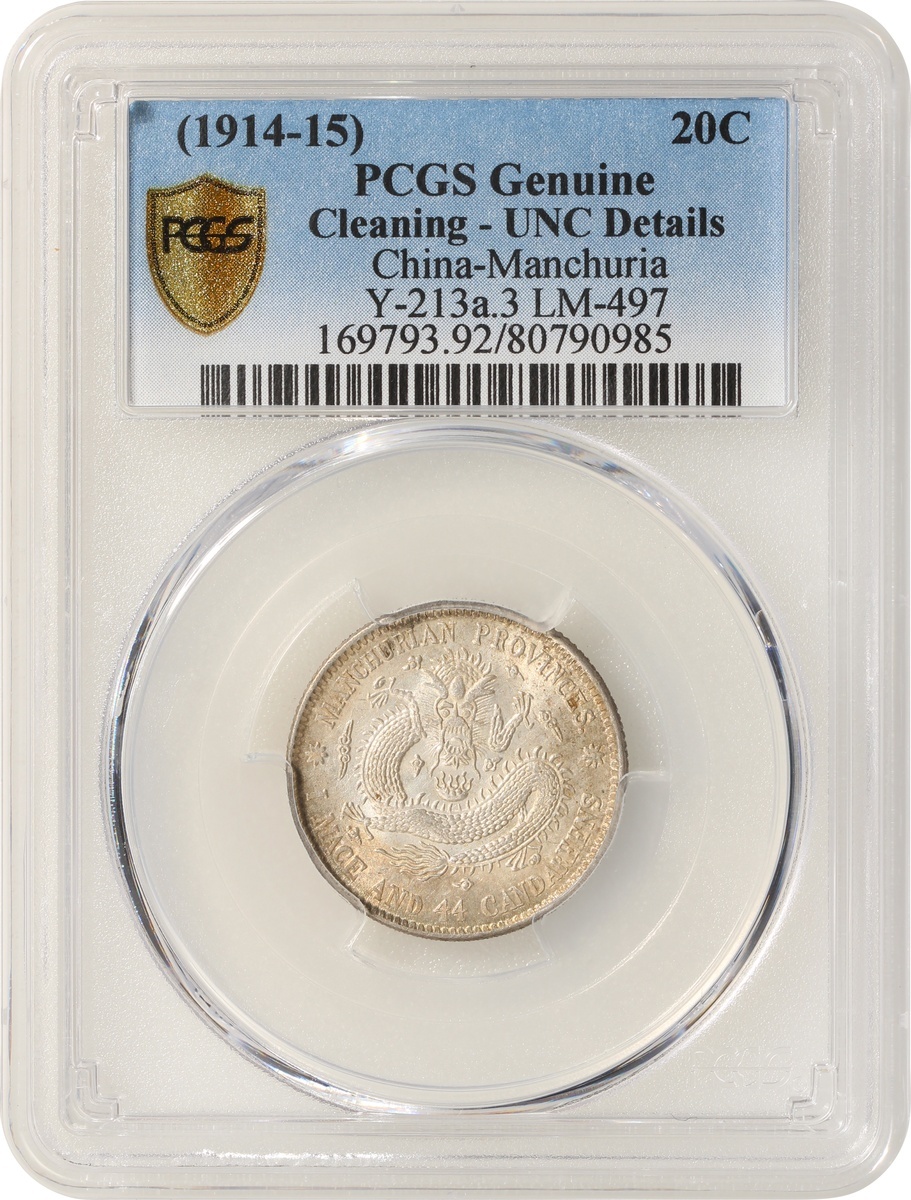 Manchuria Province, silver 20 cents, Xuantong Yuan Bao, (1914-15), (Y-213a.3, LM-497), PCGS UNC Detail, cleaning. #80790985